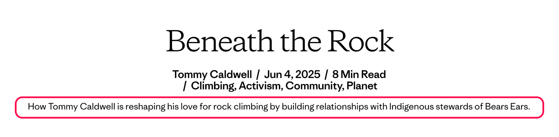 “Tommy Caldwell 正在透過與 Bears Ears 地區的原住民守護者建立聯絡,重新定義他對攀巖的熱愛。”這個摘要具體解釋了文章講什麼,補充了標題中沒有說明的關鍵資訊