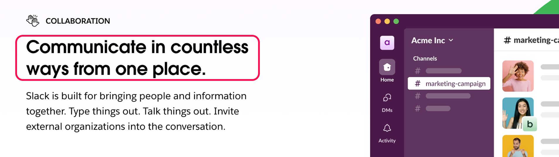 Slack 主標題:“在一個平臺中實現多種溝通方式。” 補充說明文字進一步解釋了 Slack 的功能和使用場景:支援文字、語音等多種交流方式,還能跨組織協作。右側 UI 示例:Slack 的使用者介面,尤其是頻道(Channel)功能,並附帶了使用者頭像,突出了溝通的直觀性和人性化。