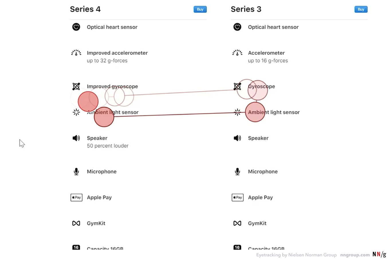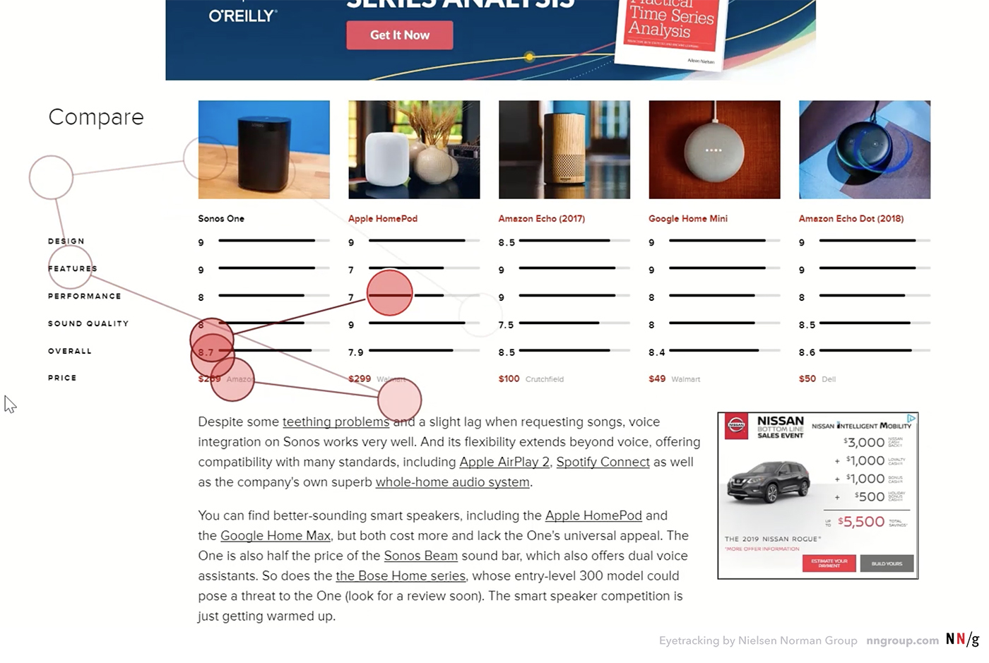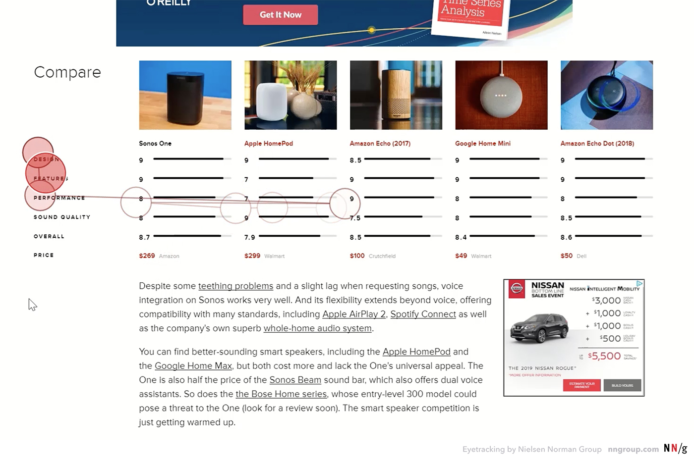 案例:在CNET網站的一位使用者快速瀏覽Sonos One音箱的對比表後,採用草坪機模式掃描整個表格,但隨後僅關注Sonos One、Apple HomePod和Amazon Echo三列,忽略了其他部分。