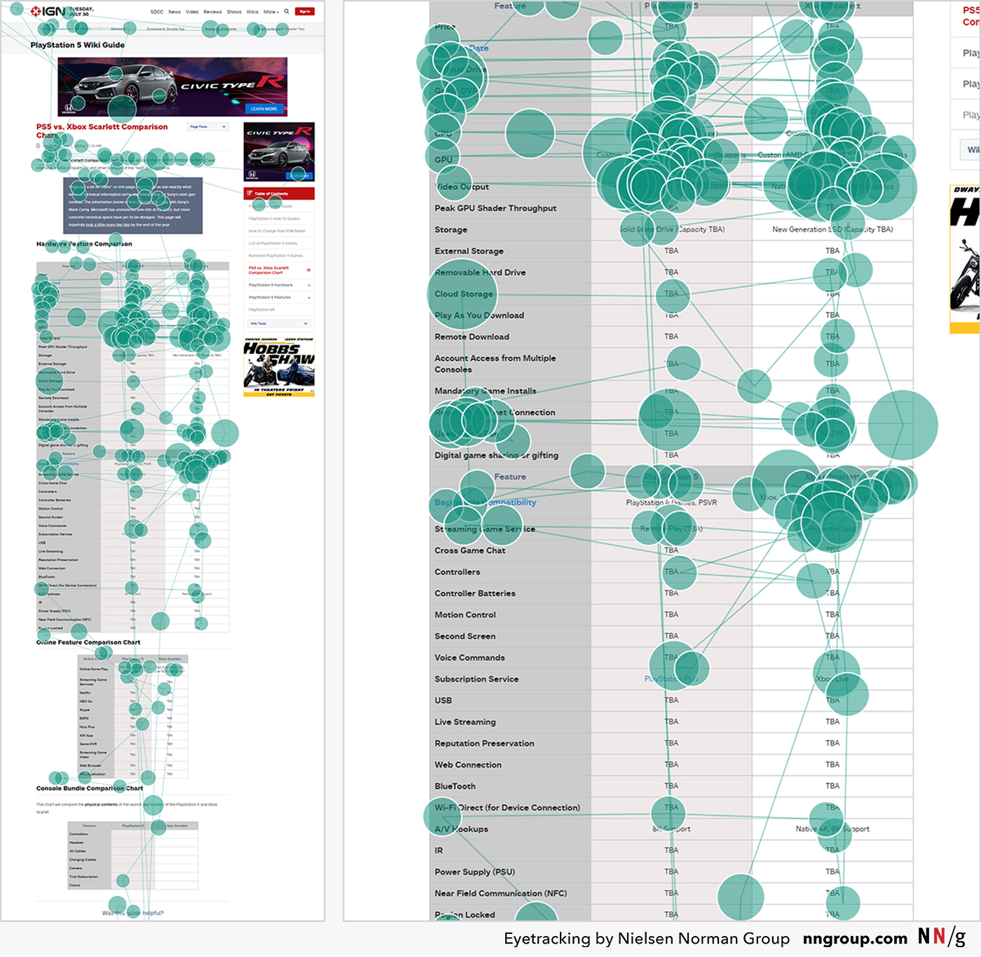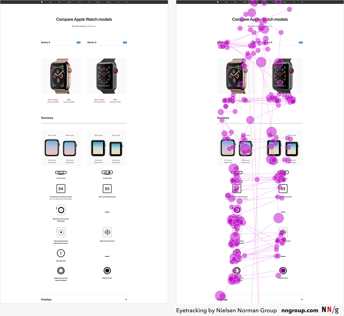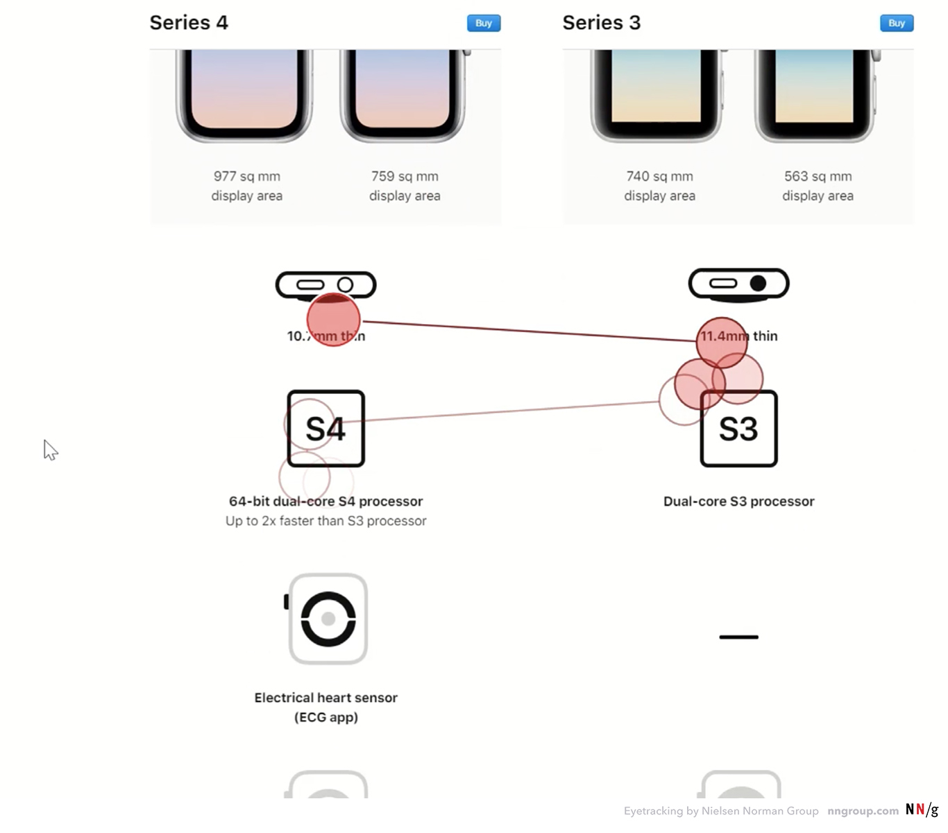 案例:在CNET網站的一位使用者快速瀏覽Sonos One音箱的對比表後,採用草坪機模式掃描整個表格,但隨後僅關注Sonos One、Apple HomePod和Amazon Echo三列,忽略了其他部分。