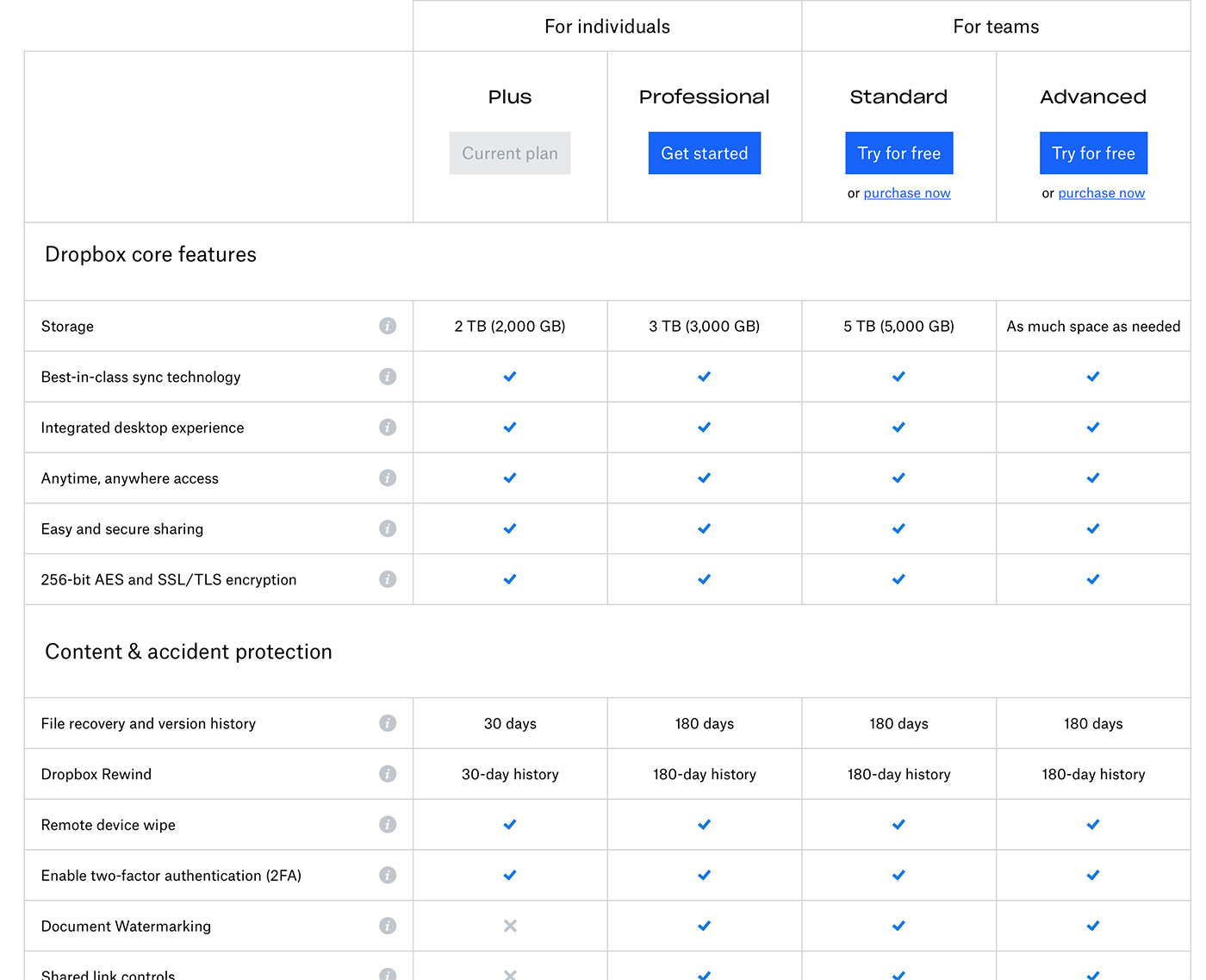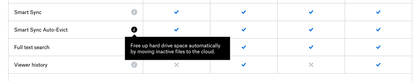 6. 提供術語定義:在表格中新增術語工具提示或說明,幫助使用者快速理解複雜概念。Dropbox表格為“Smart Sync Auto-Evict”提供了懸停工具提示,顯著降低了使用者理解難度。