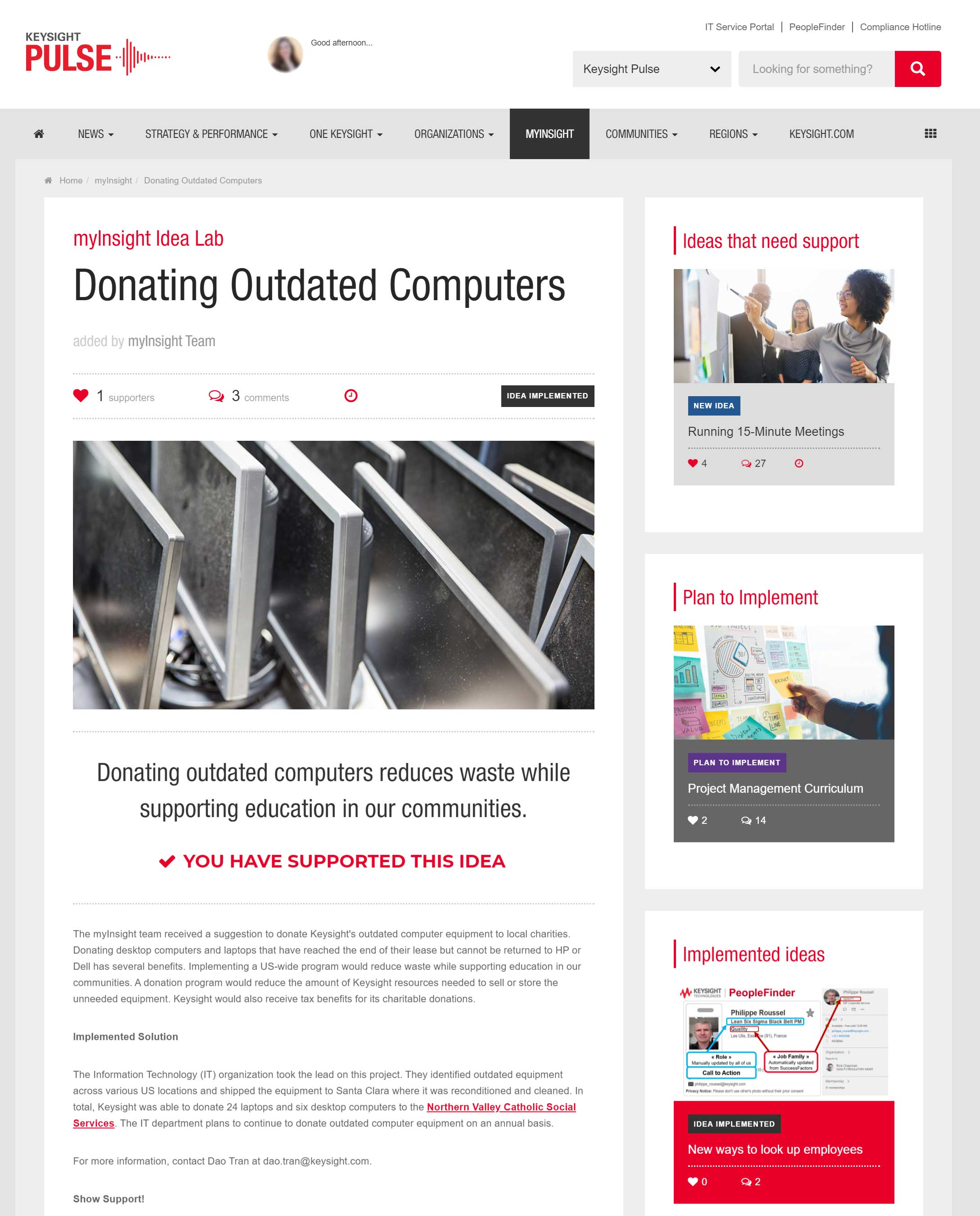 Keysight的“MyInsight”計劃為員工提供了一個提交改進建議的平臺,其他員工可以投票或補充意見。特點: 每個建議都有明確的狀態標記(例如“新提案”“計劃實施”),還有倒計時圖示提醒員工此建議是否仍開放討論。