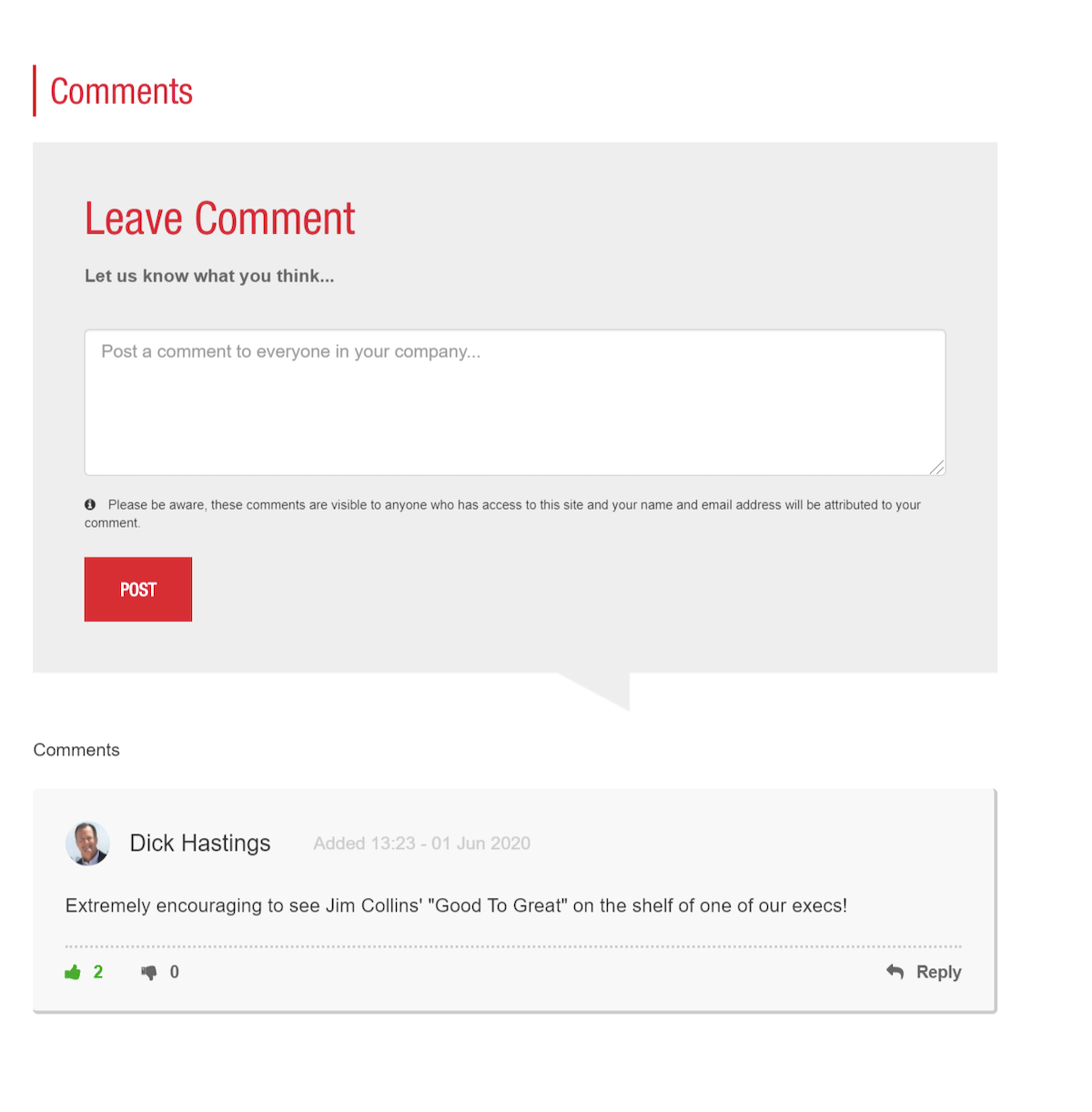 新聞文章和影片底部的評論功能為員工提供了互動的機會。員工可以點贊、回覆他人的評論,從而增強歸屬感和系統的活躍度。