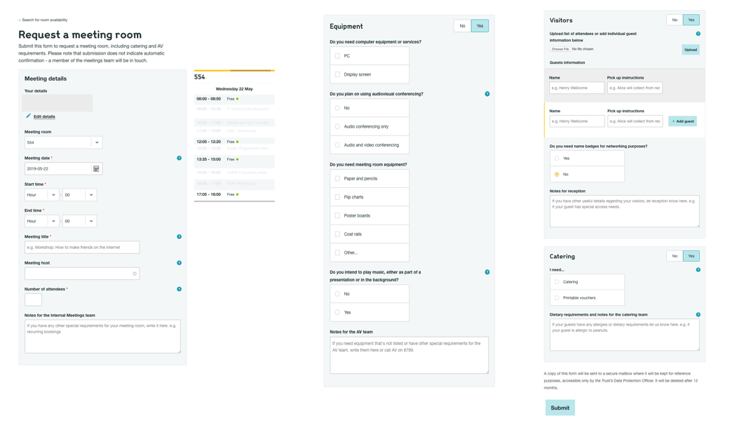 - 事件預訂表單將裝置、餐飲、訪客管理等功能整合到一個簡潔易用的介面中,並與內部系統無縫整合。