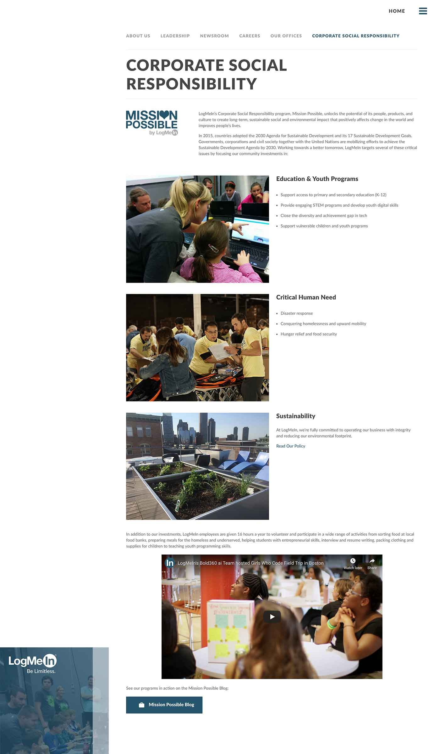 示例:LogMeIn在其企業社會責任部分採用了真實和謙遜的語氣。例如,使用了“積極影響世界變革並改善人們的生活”以及“釋放其人員、產品和文化的潛力,以創造長期、可持續的社會和環境影響”等表述。使用者在閱讀後認為該公司真誠關心社會而非僅為作秀,表示“他們真正在意這個議題,這樣做是因為他們在乎。”