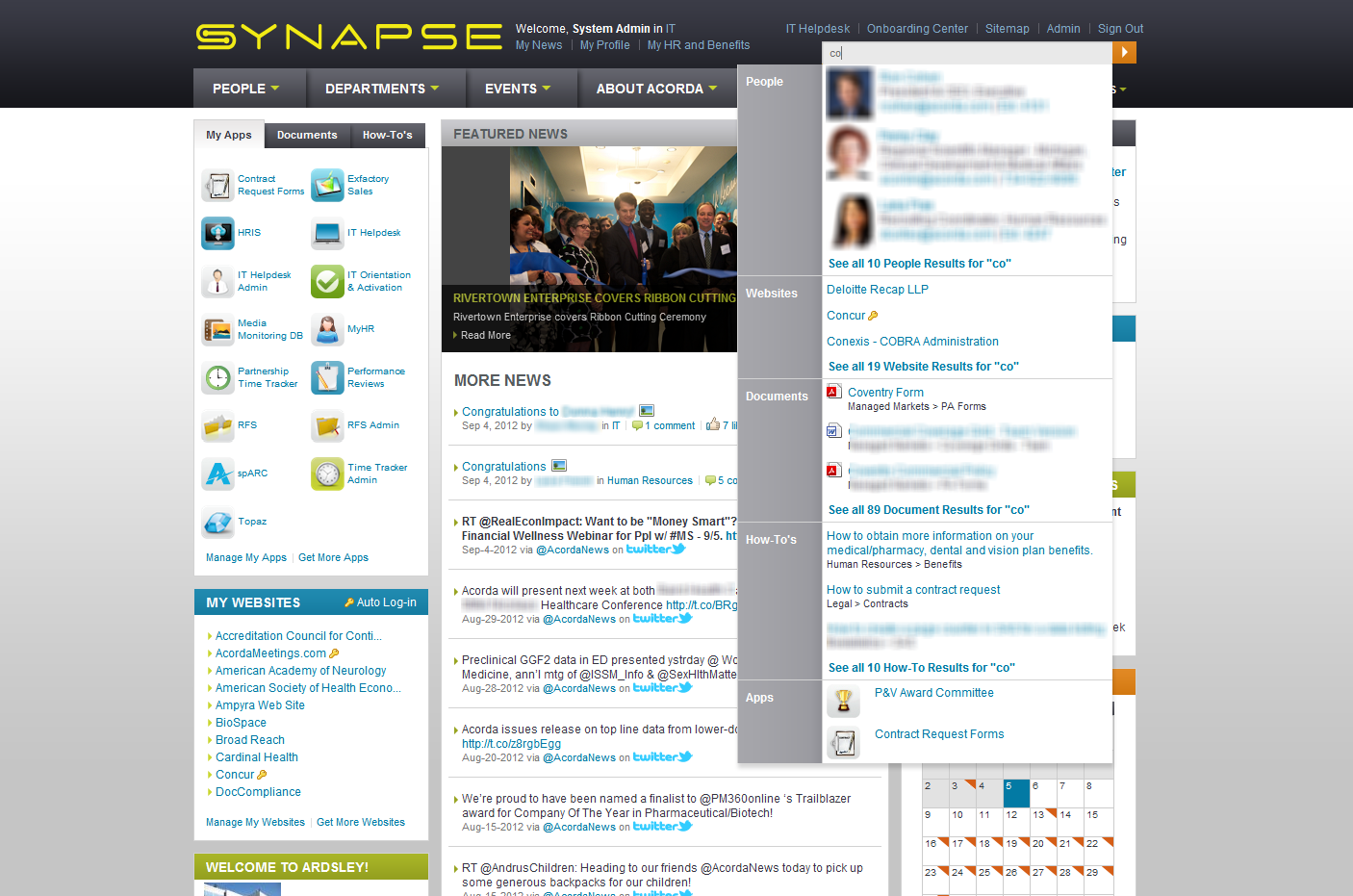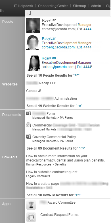 2012年後,員工搜尋功能出現突破性創新,如即時顯示帶圖片的搜尋建議和統一的搜尋框設計。Acorda Therapeutics, Inc. 的內聯網即採用了這種模式。
