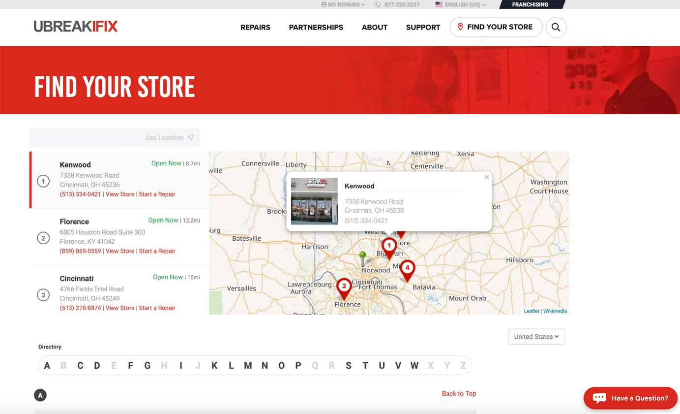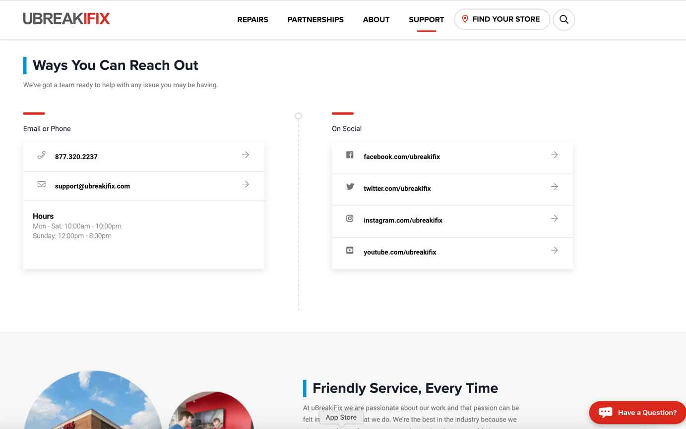 案例: UBreakIFix.com提供社交媒體連結作為附加選項,而非唯一聯絡方式。