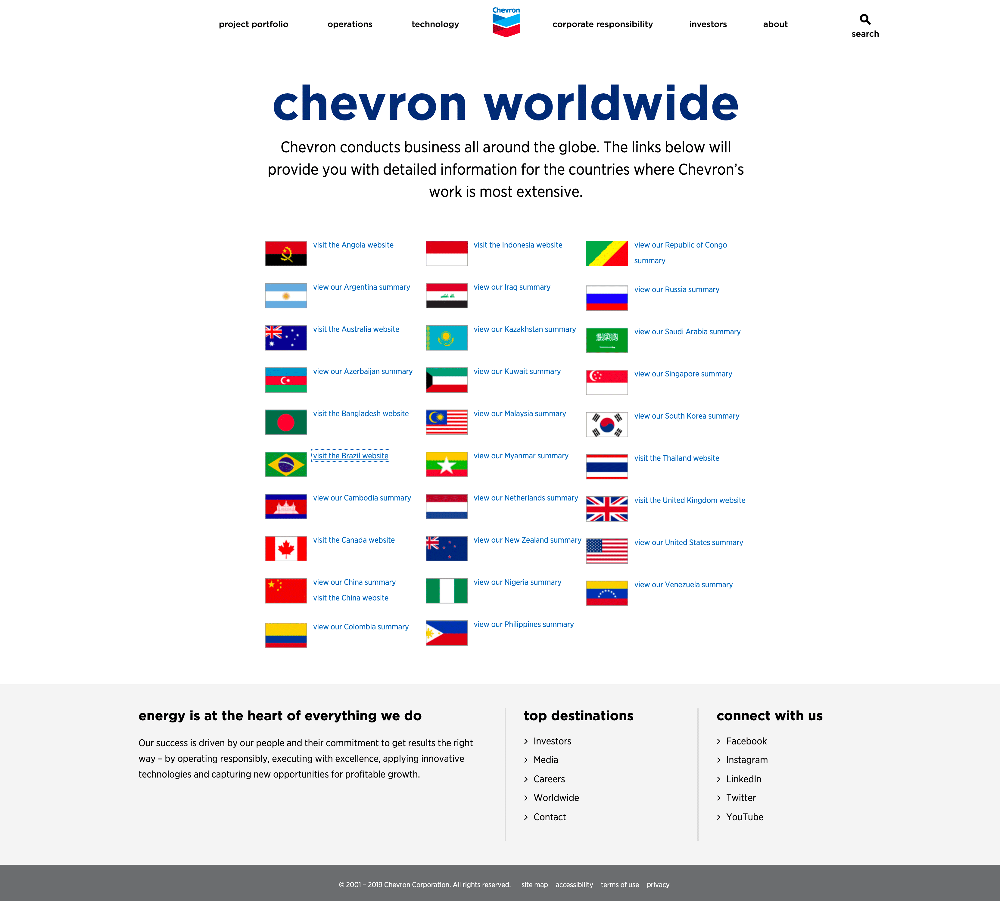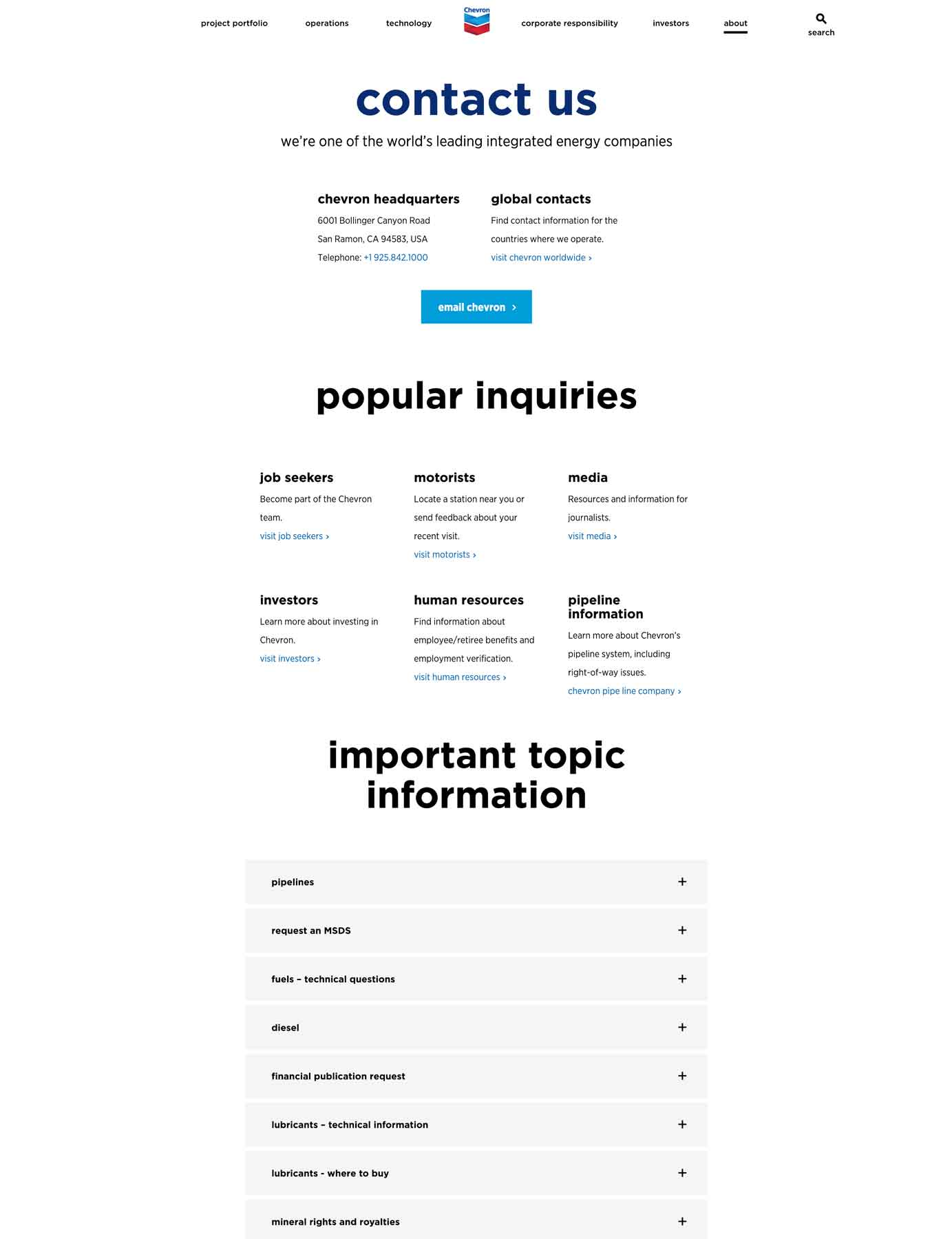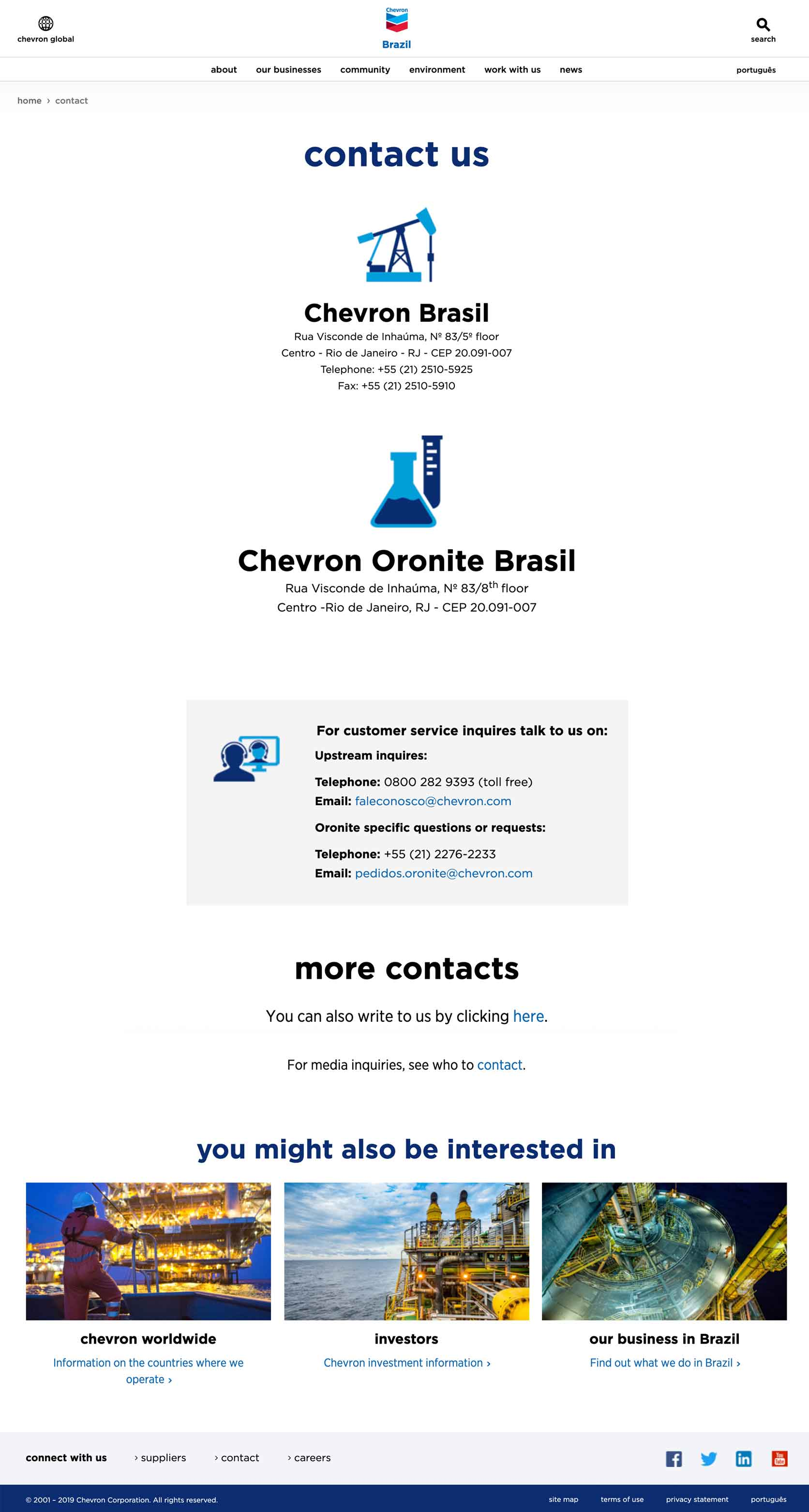 國際使用者: 為國際使用者提供各地區聯絡資訊。如Chevron網站為各國辦事處提供詳細聯絡頁面。