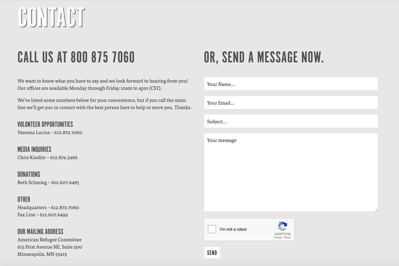 表單設計: 若使用表單,限制3-5個欄位,僅詢問必要資訊。美國難民委員會的表單簡潔,不影響使用者體驗。
