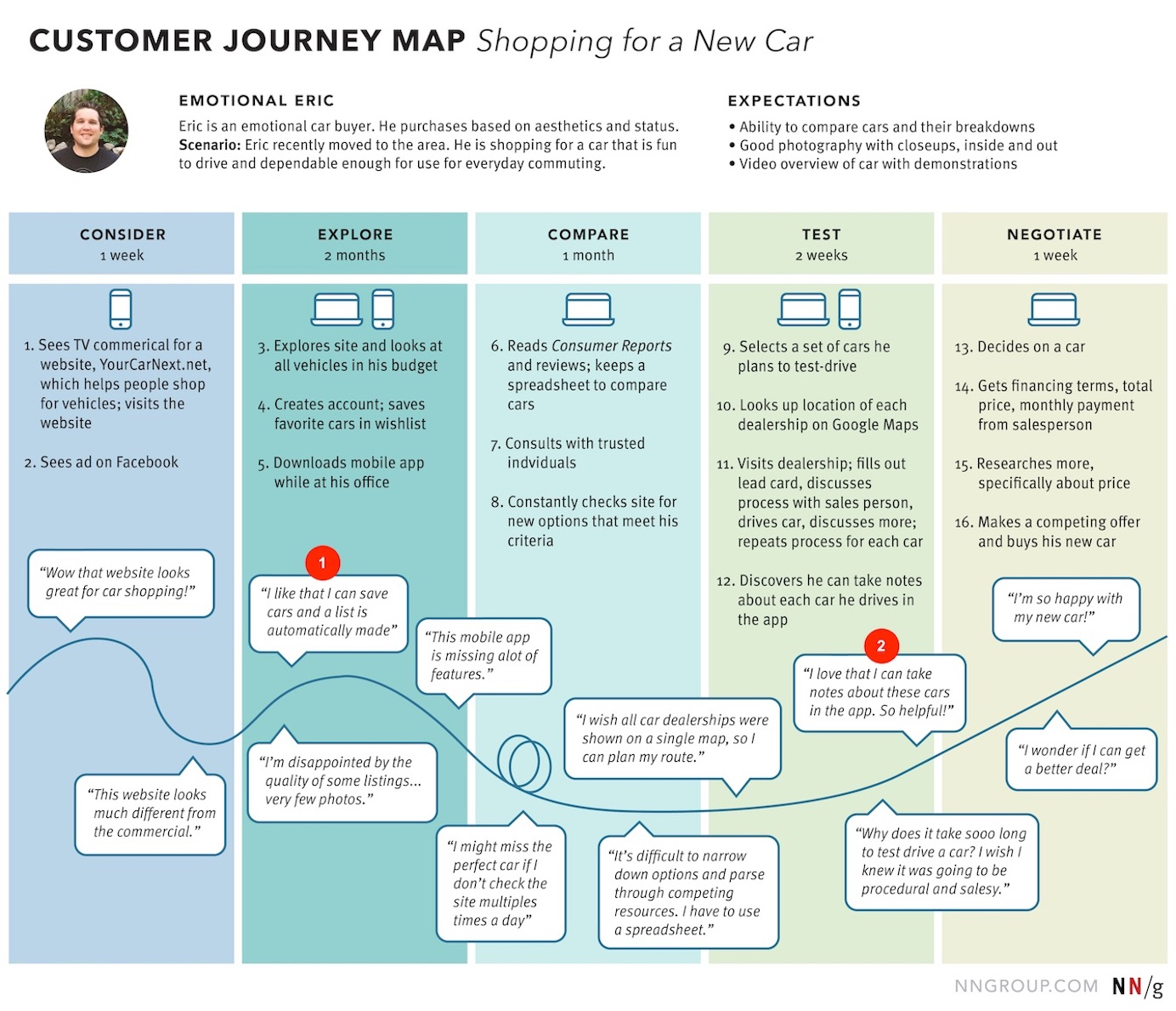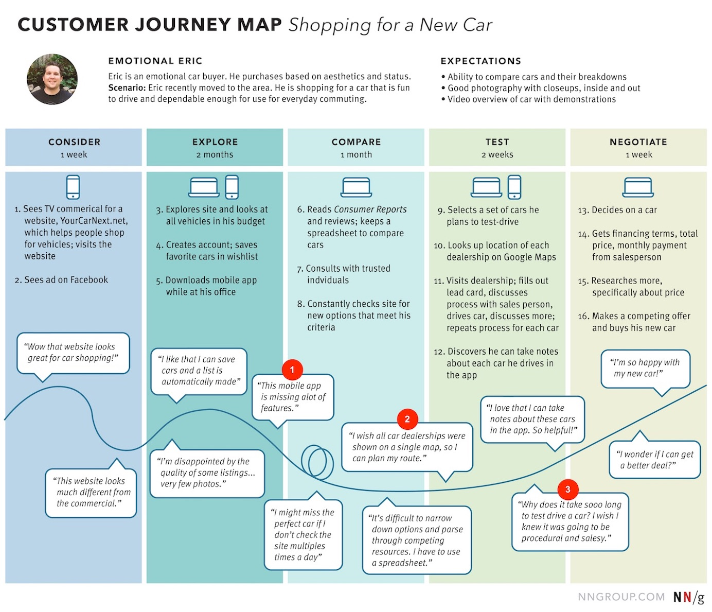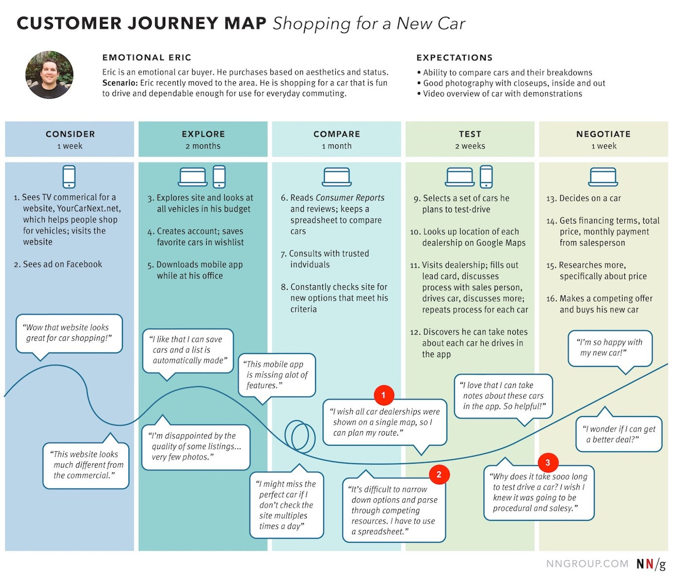 案例:比較和試駕階段是 Eric 體驗的最低點,他需要手動整理車輛資訊並規劃路線。