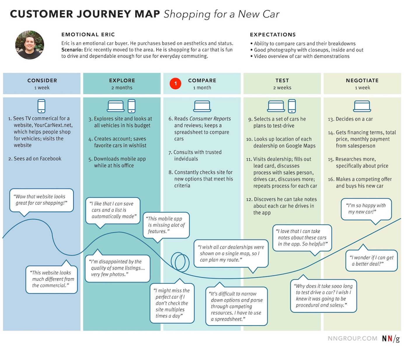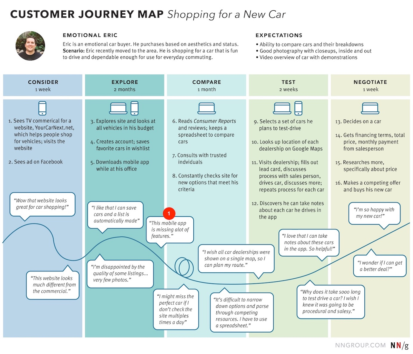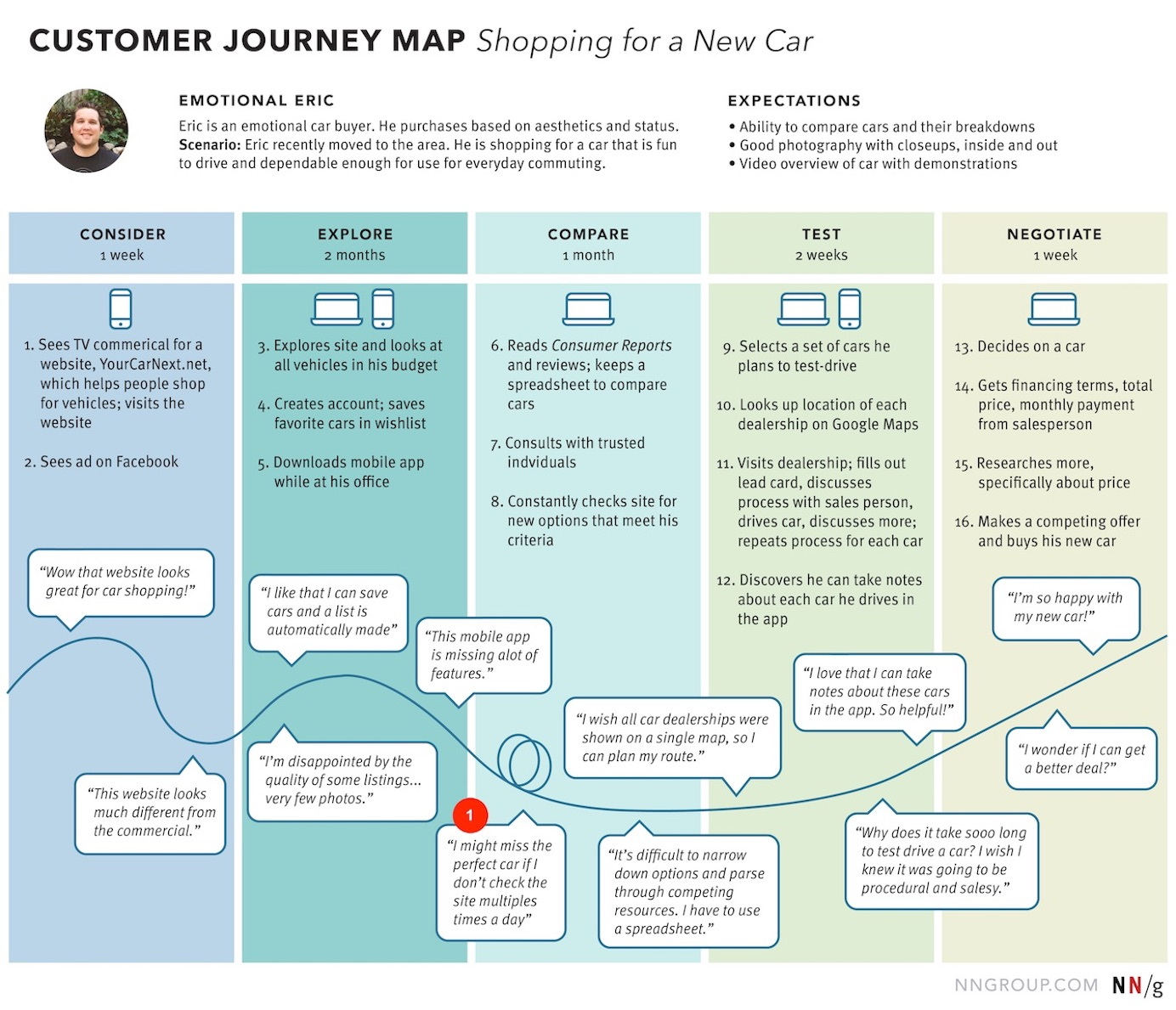 案例:比較和試駕階段是 Eric 體驗的最低點,他需要手動整理車輛資訊並規劃路線。