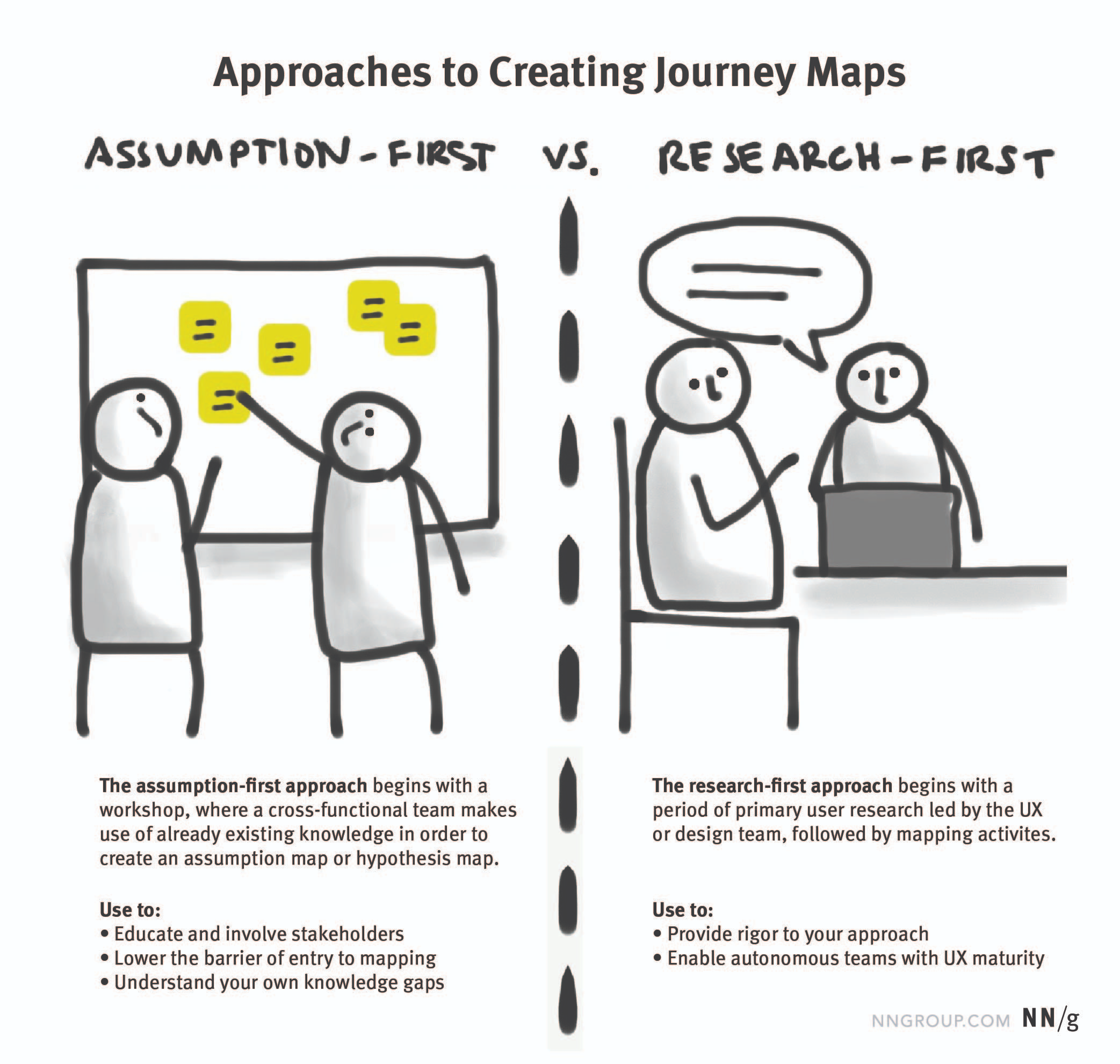 對假設優先和研究優先的旅程圖繪製方法的比較。
