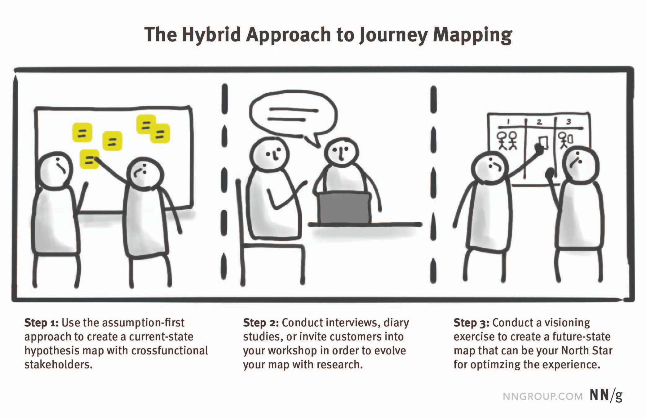 方法:先進行使用者研究,如訪談或觀察,收集新資料,再繪製旅程圖。