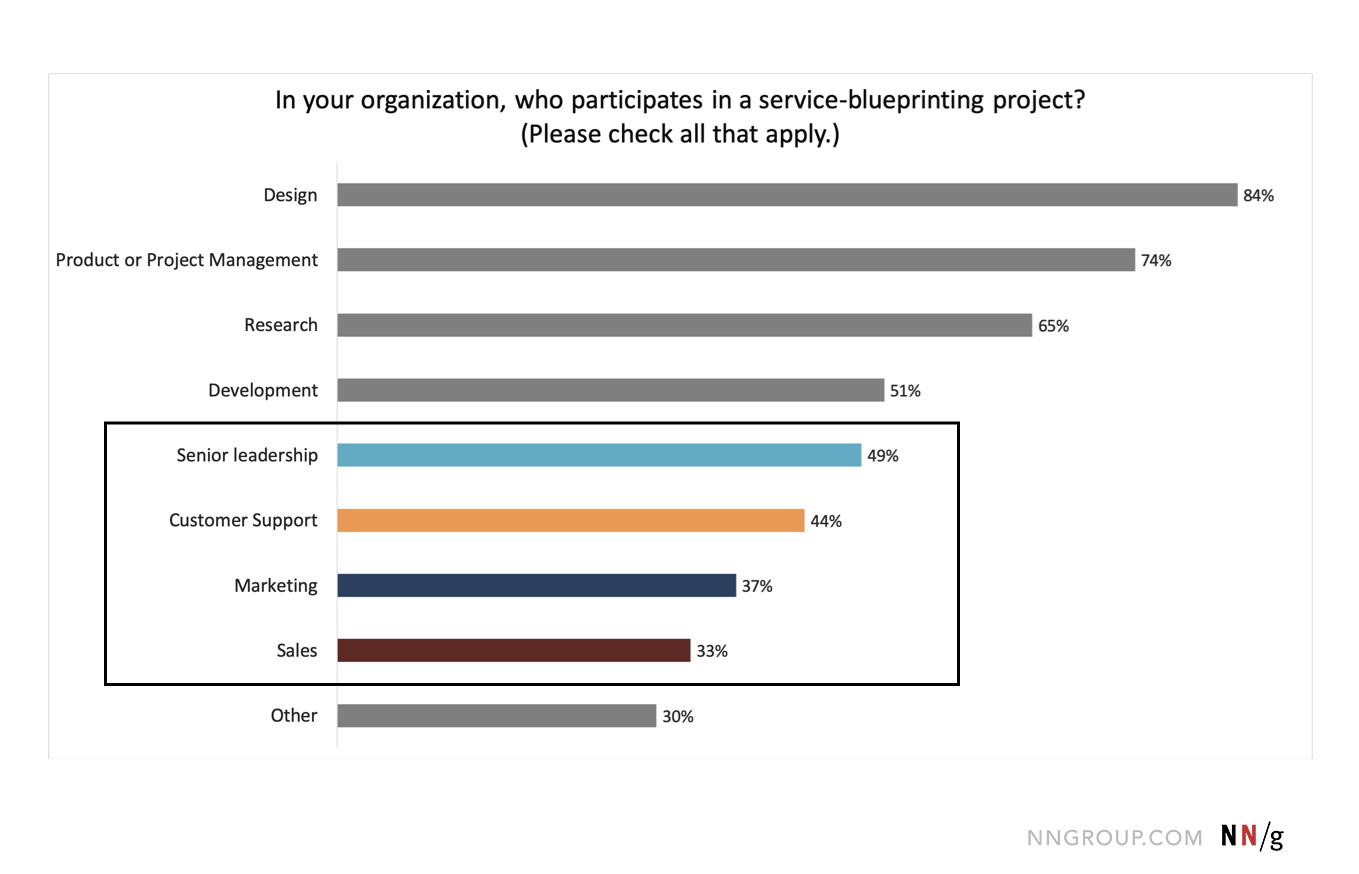 儘管設計、產品管理和研究團隊通常會參與服務藍圖的工作,但高階管理層、客戶支援、營銷和銷售團隊的參與率不到一半。這種缺乏跨部門合作可能會導致: