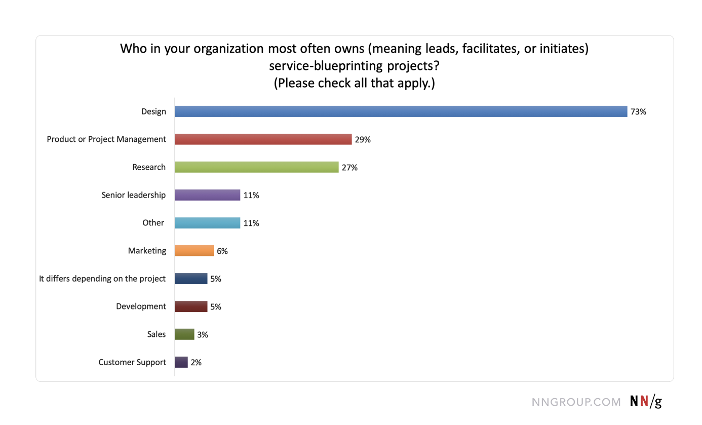 調查顯示,設計團隊最常主導服務藍圖的相關工作,其次是產品/專案管理團隊和研究團隊。部分情況下,不同團隊會共同負責藍圖的工作。