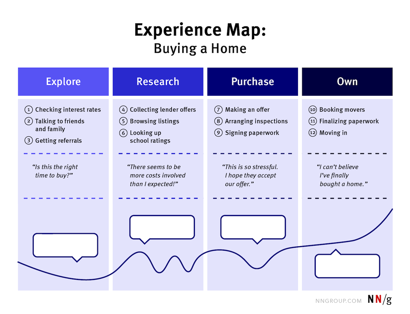 一個時間順序地圖的示例:一個體驗地圖,它捕捉了使用者在購買新房過程中的每一步的行動、想法、感受和痛點