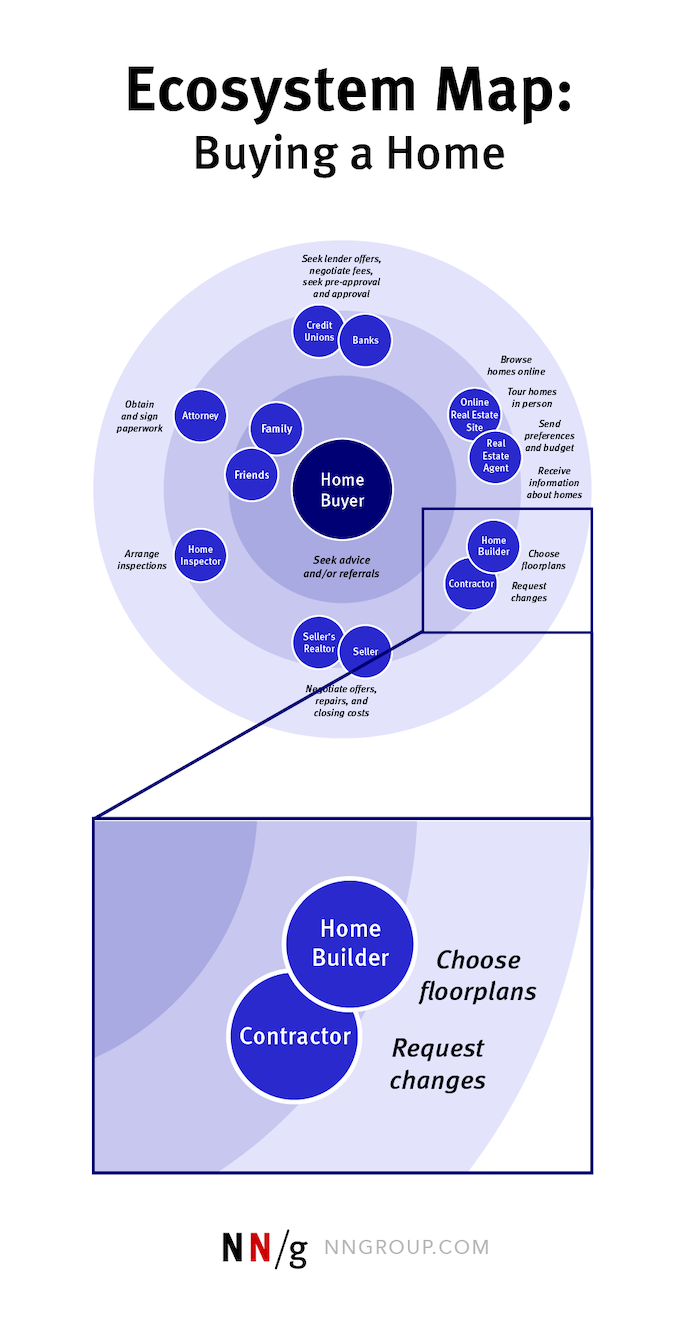 家庭購房體驗的生態系統圖示例。購房者周圍有許多人、組織和服務提供商,他們在購買新房時可能會與之互動。