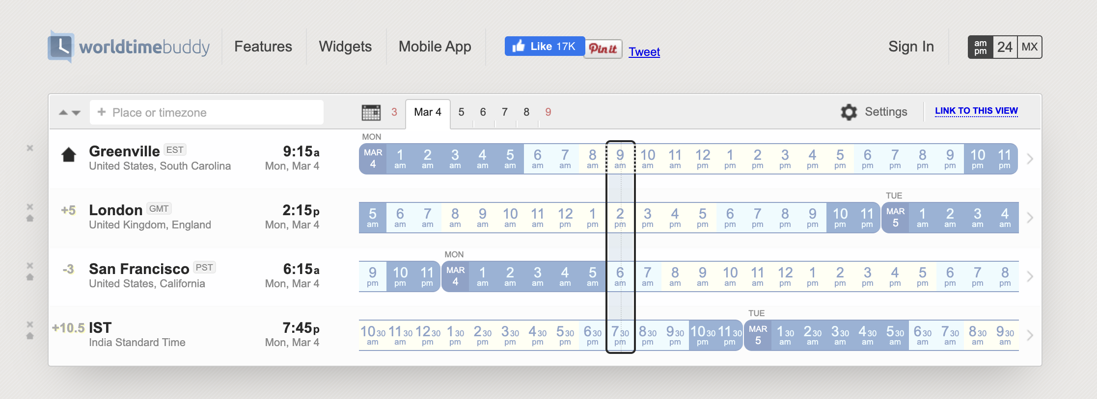 設計建議:根據使用者需求呈現輸出,例如在不同時區顯示工作、早晚和夜間時間的色塊區分,以便使用者輕鬆找到合適的會議時間。