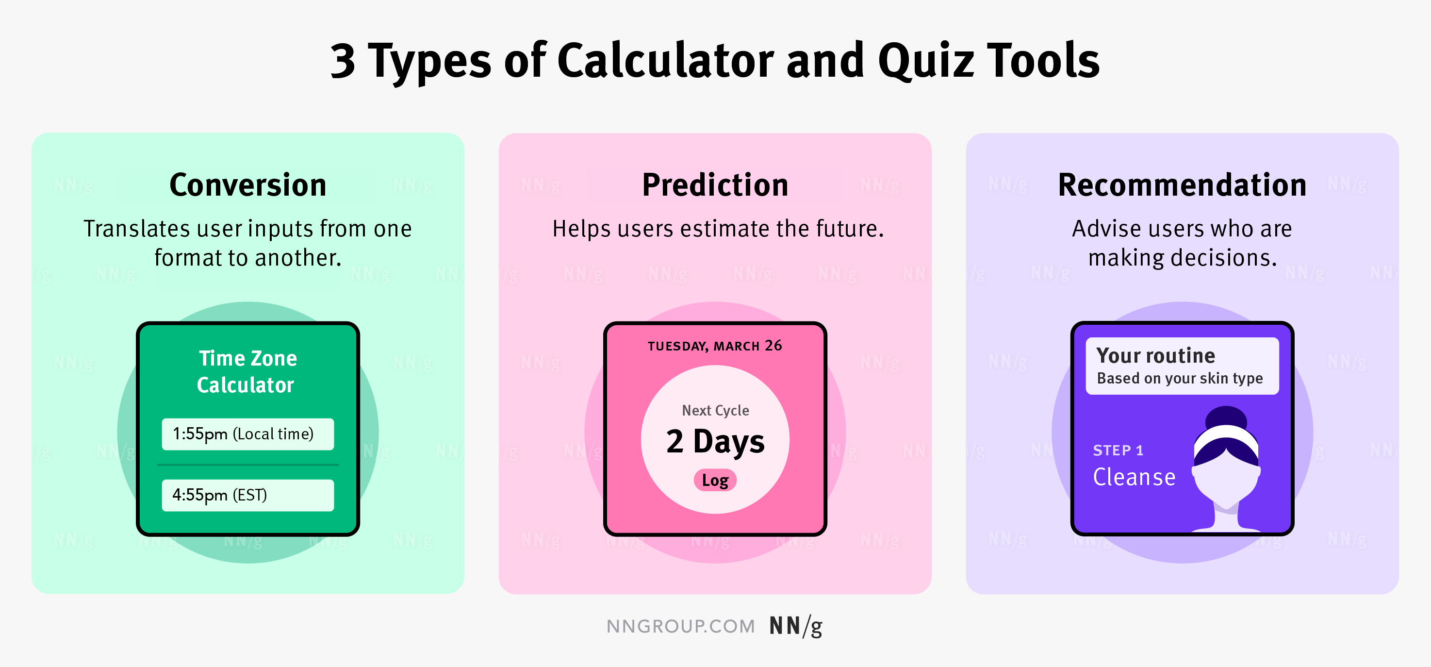 大多數計算器和測驗工具的功能包括:轉換輸入資料、預測未來或提供個性化推薦。它們幫助使用者在不同情境下做出決策。根據輸出型別,這些工具通常分為三類:轉換型、預測型和推薦型。