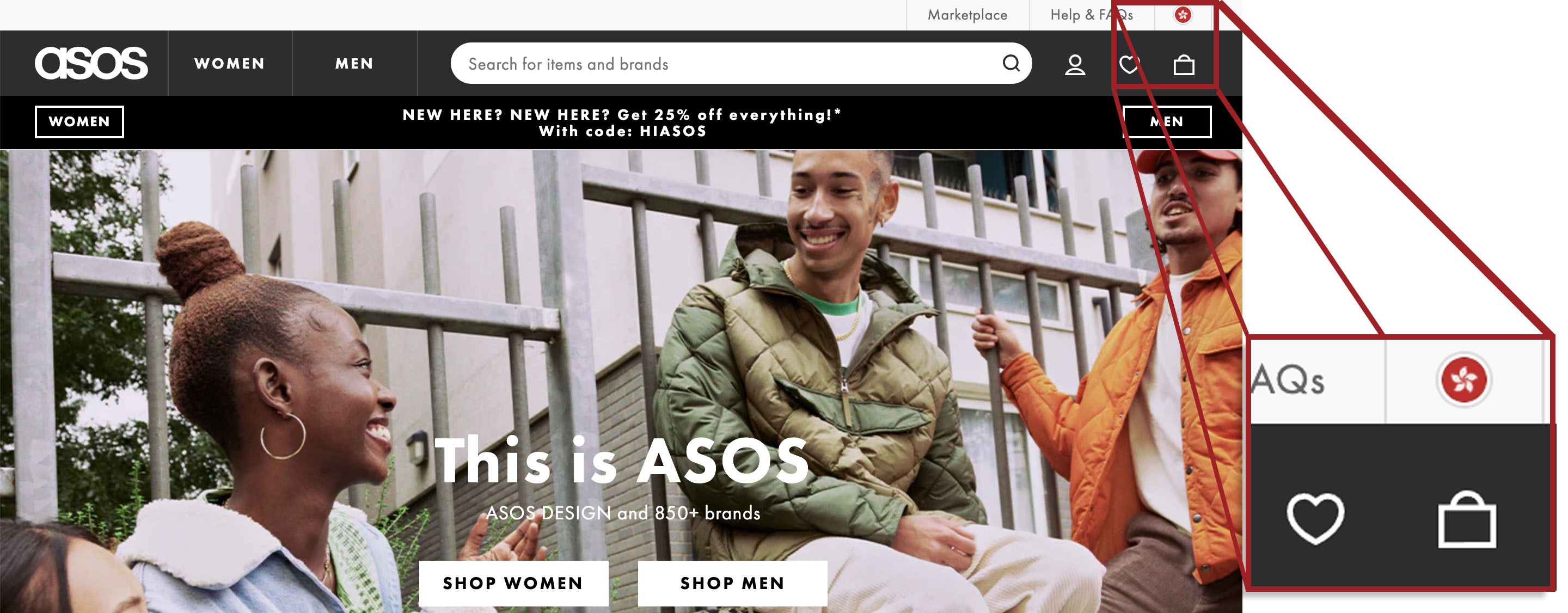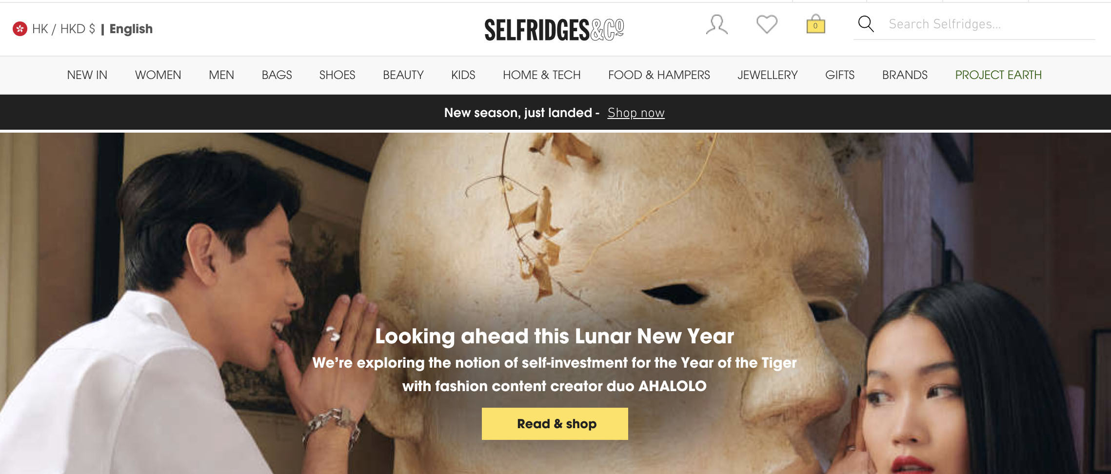使用國旗、貨幣符號等組合,增加切換器的可識別性。例如,Selfridges使用了香港國旗、貨幣符號和語言標籤組合,使語言切換器更易發現。