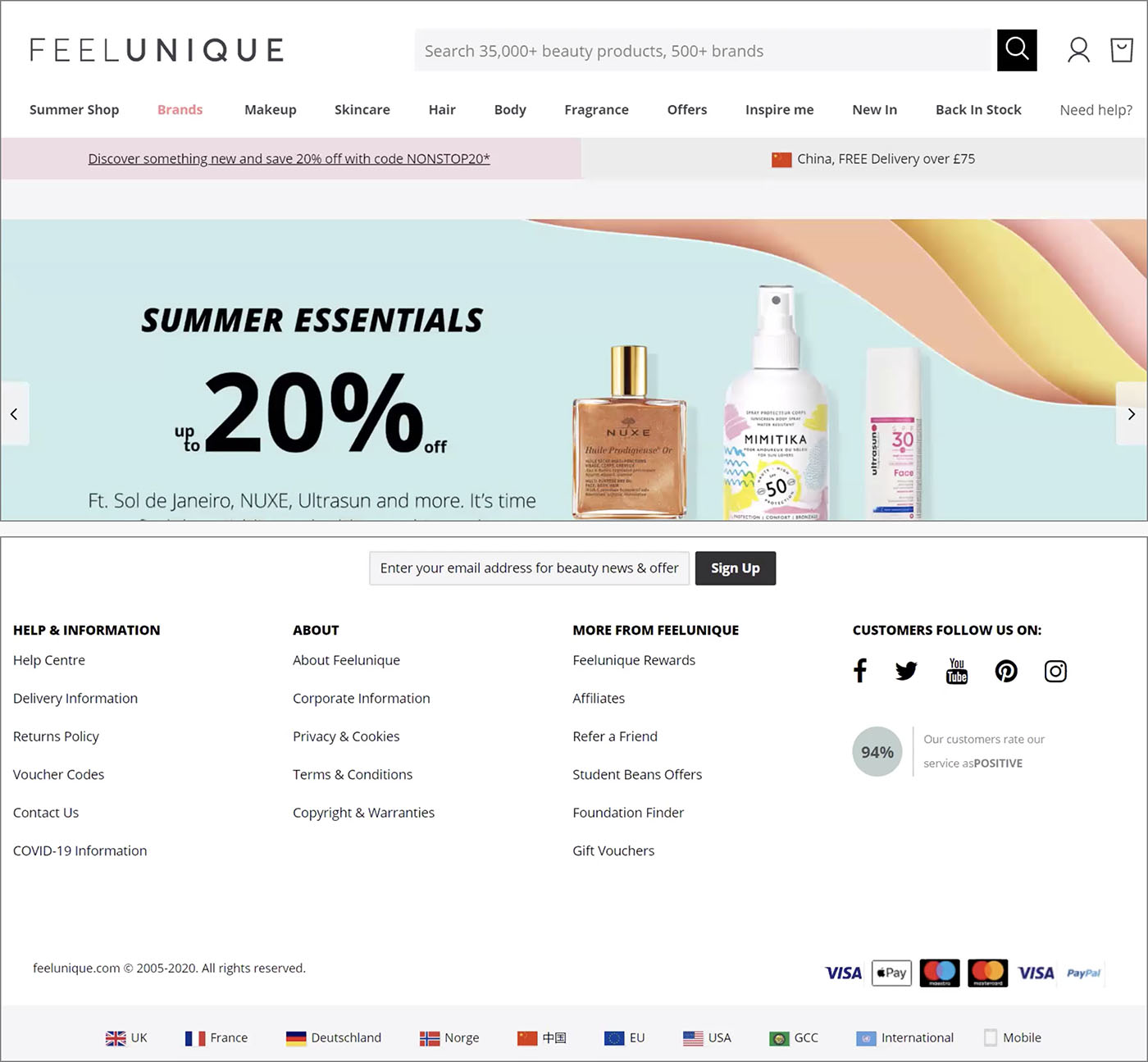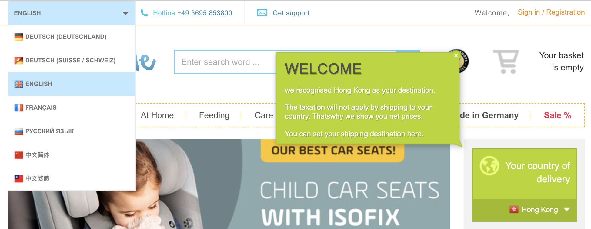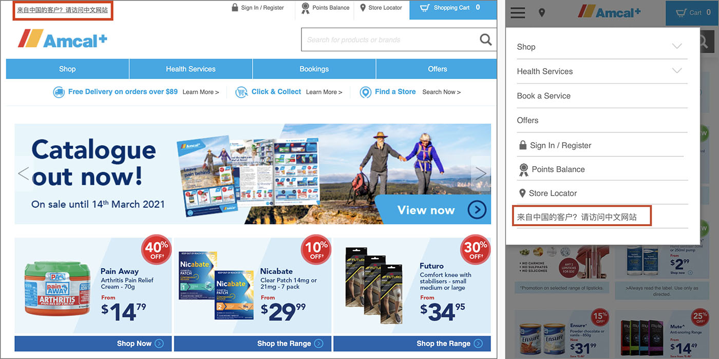 在一項針對中國的電商研究中發現,提供中文版或專門的中國站點是國際品牌的加分項。當使用者進入外語站點時,通常會首先尋找中文版本,尤其是在對特定分類或產品名不熟悉的情況下(如藥品)。例如,一位想購買魚油的中國使用者表示,雖然能看懂部分英文,但擔心藥品術語會出現誤解,因此很高興看到該澳大利亞藥房提供中文版。