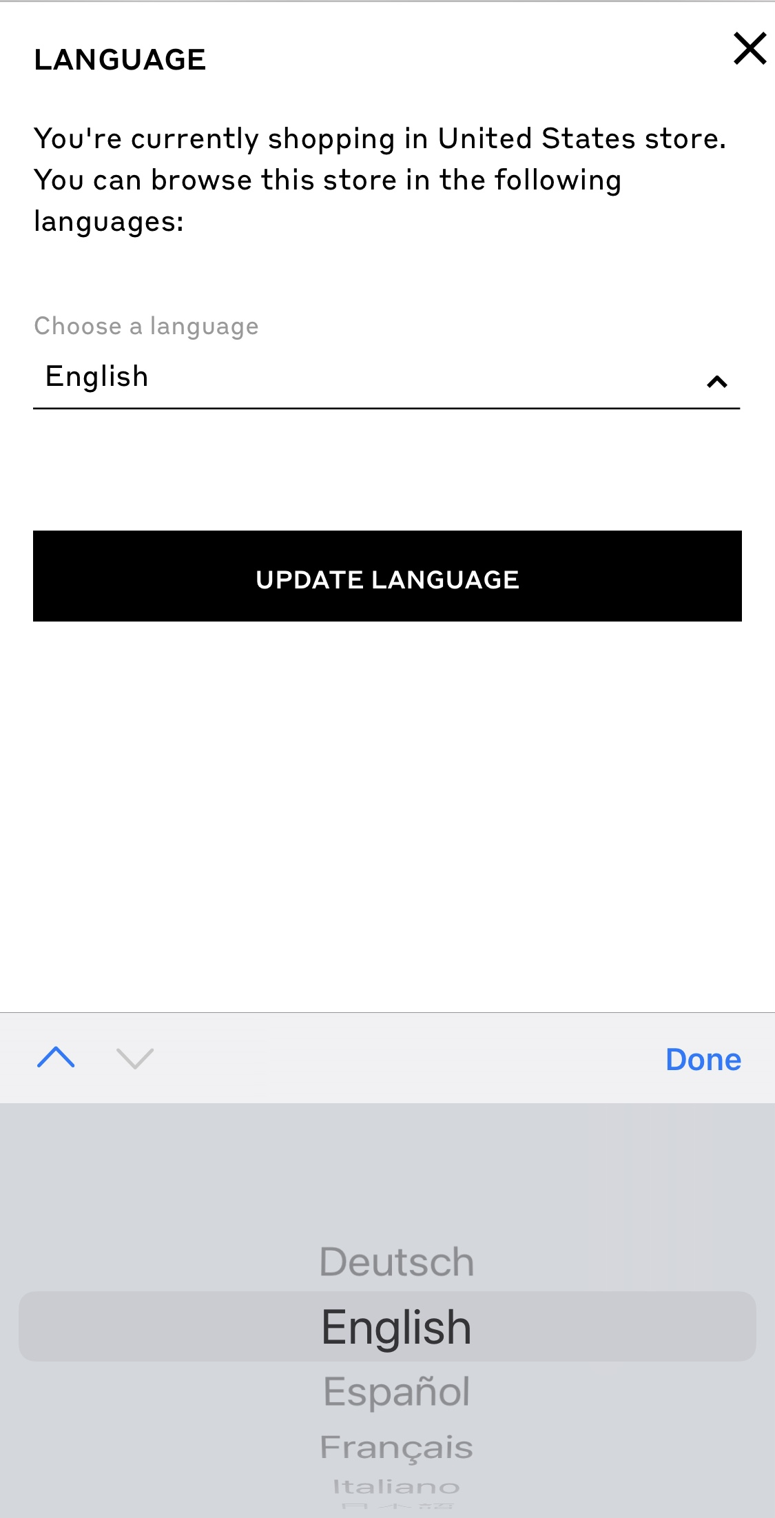 每種語言應使用其本地語言名稱顯示(如Español而不是Spanish)。Burberry在其移動站點上正確使用各語言的本地名稱,幫助使用者輕鬆識別。