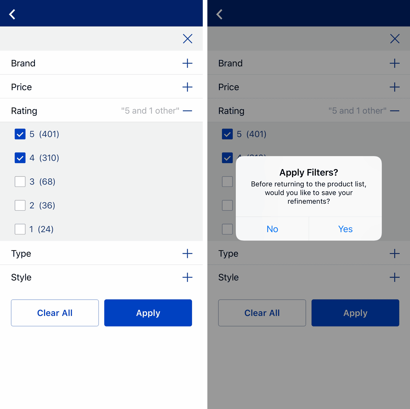Lowes移動應用:使用者在關閉篩選檢視前,系統會彈出確認對話方塊,詢問是否應用篩選條件或取消。