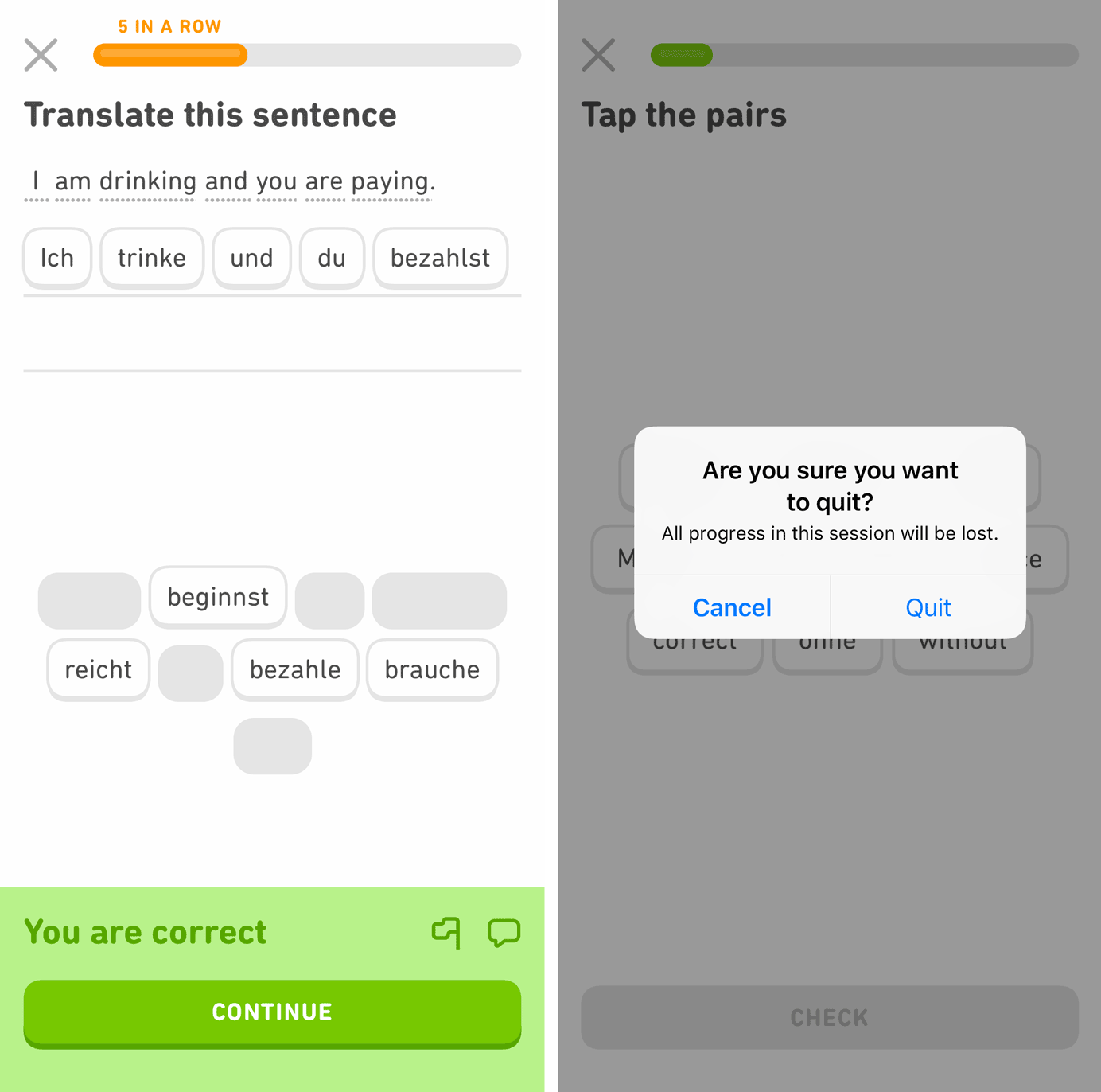 Duolingo應用:使用者在關閉未完成的課程時收到確認對話方塊,以確保不會意外丟失進度。