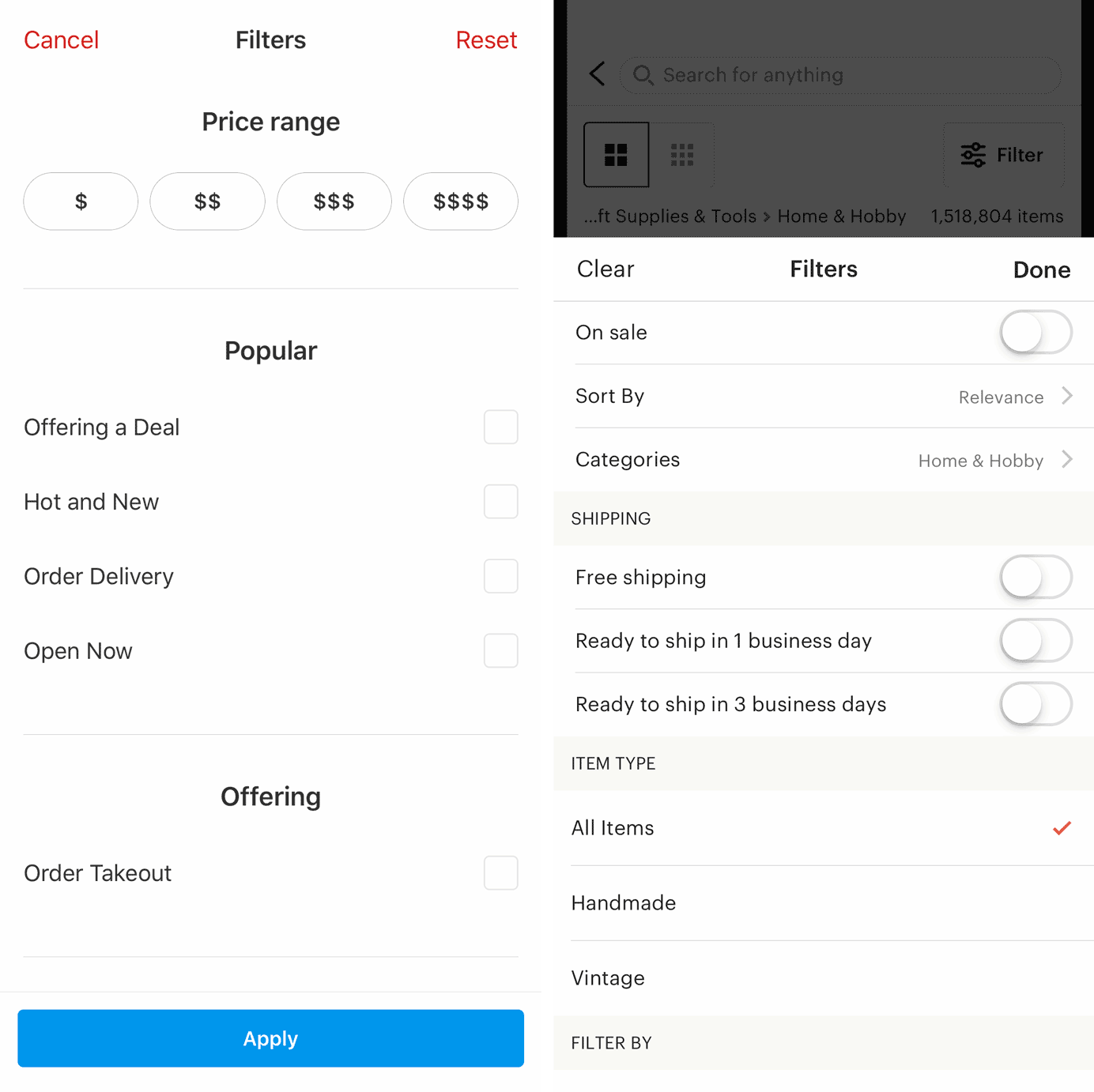 Yelp和Etsy移動應用:Yelp提供了“取消”、“重置”和“應用”按鈕,Etsy提供“清除”和“完成”按鈕。這些標籤直觀地表明不同操作的結果,避免了意外關閉或誤解操作。