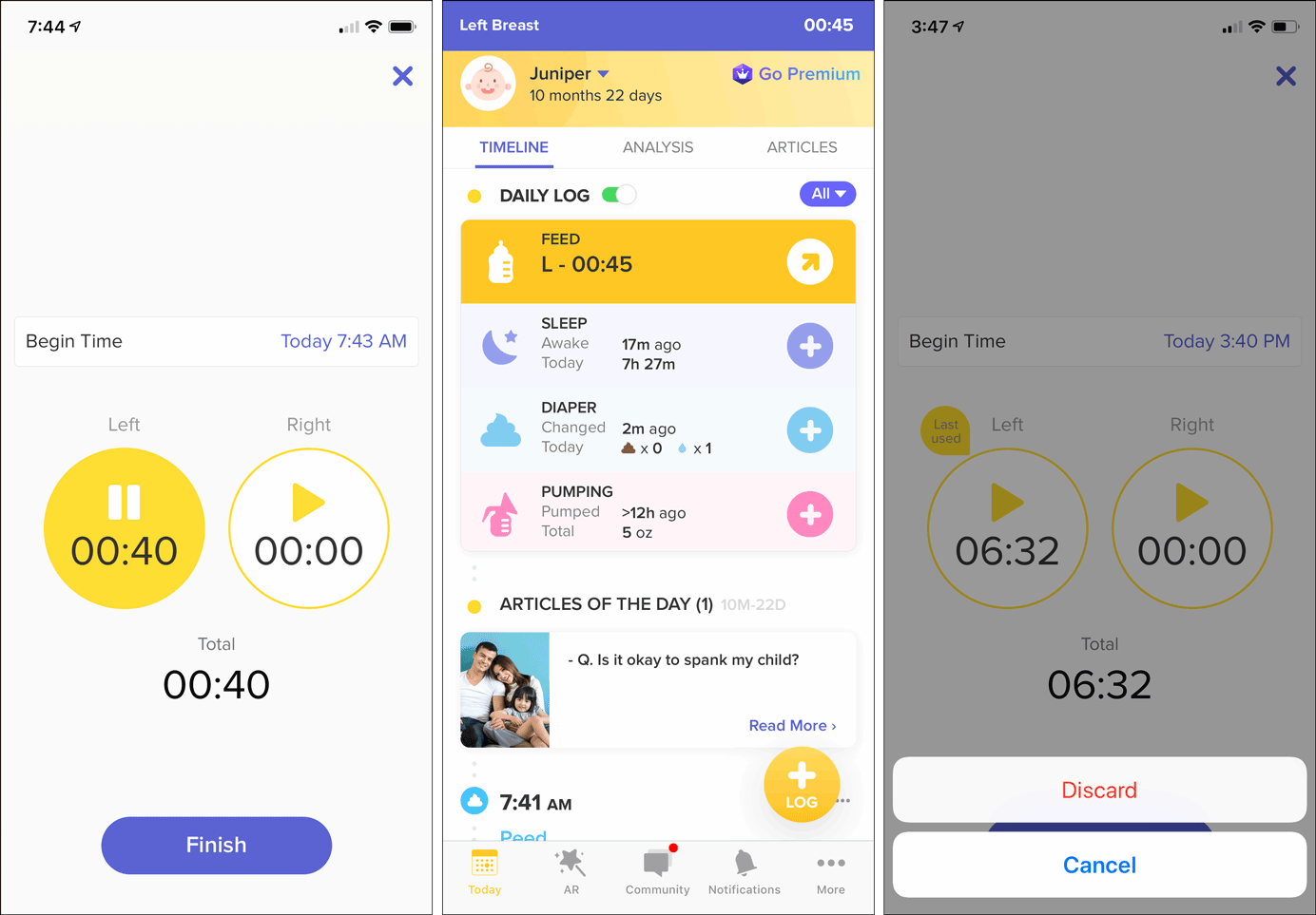 Glow Baby應用:使用者在執行計時器時可透過X圖示關閉計時器檢視,計時器繼續在後臺執行;若計時器暫停,X圖示則會彈出“放棄”或“取消”選項,以確保使用者操作準確。
