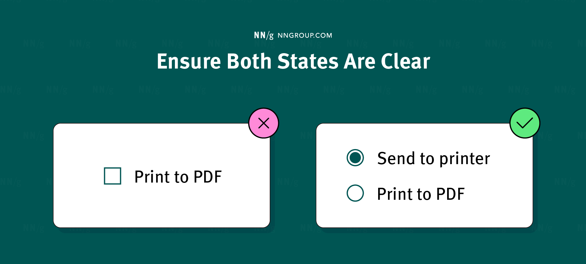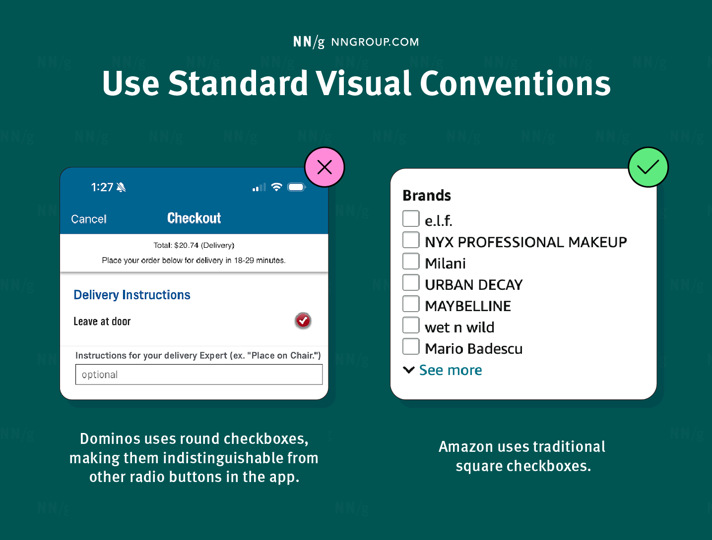使用標準視覺規範:使用者期望核取方塊為方形(帶或不帶圓角),並帶有勾選標記。避免使用圓形核取方塊,以免與單選按鈕混淆。