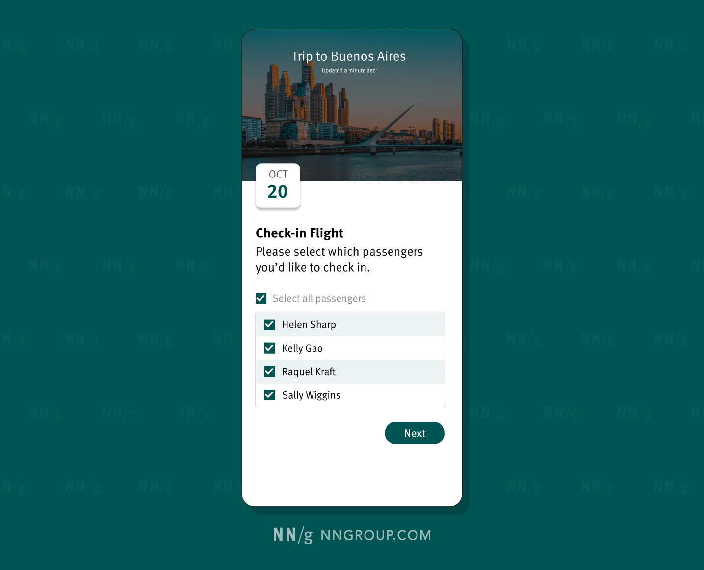 例如,在航空值機時,應用可能要求"選擇辦理登機的乘客"。父核取方塊為"所有乘客",每位乘客有一個子核取方塊。這種結構便於一人為整個團隊辦理登機,提升體驗。