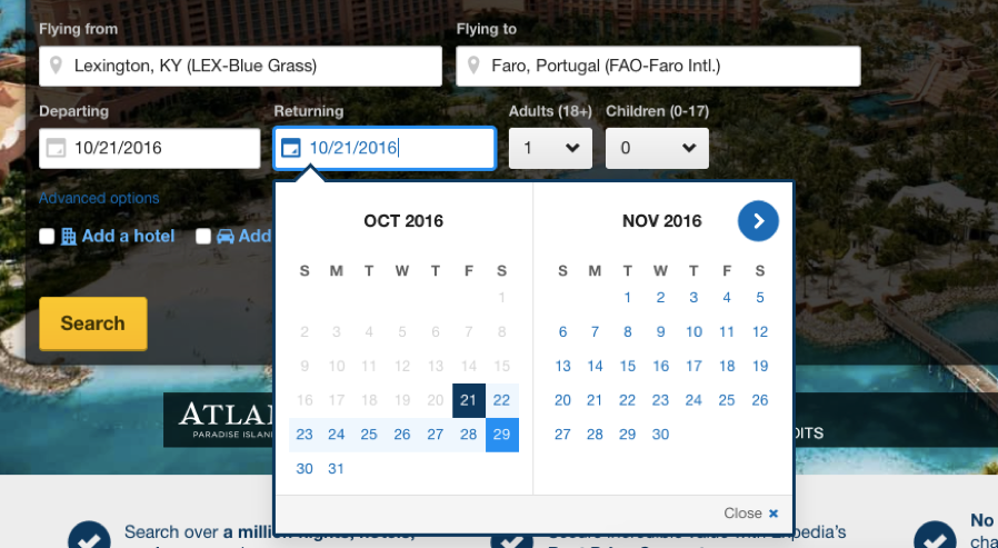 - 返回日期不應早於出發日期,也不應早於當前日期。