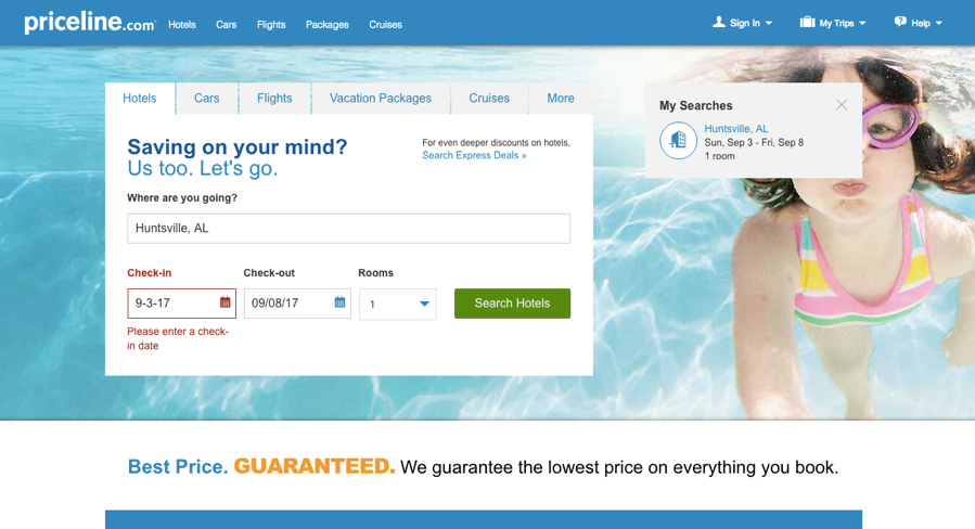 案例:Priceline。Priceline 拒絕了使用者輸入的9-3-17,而接受了09/08/17,儘管表單沒有顯示任何格式要求。這種設計應改進為自動解析使用者輸入的日期格式。
