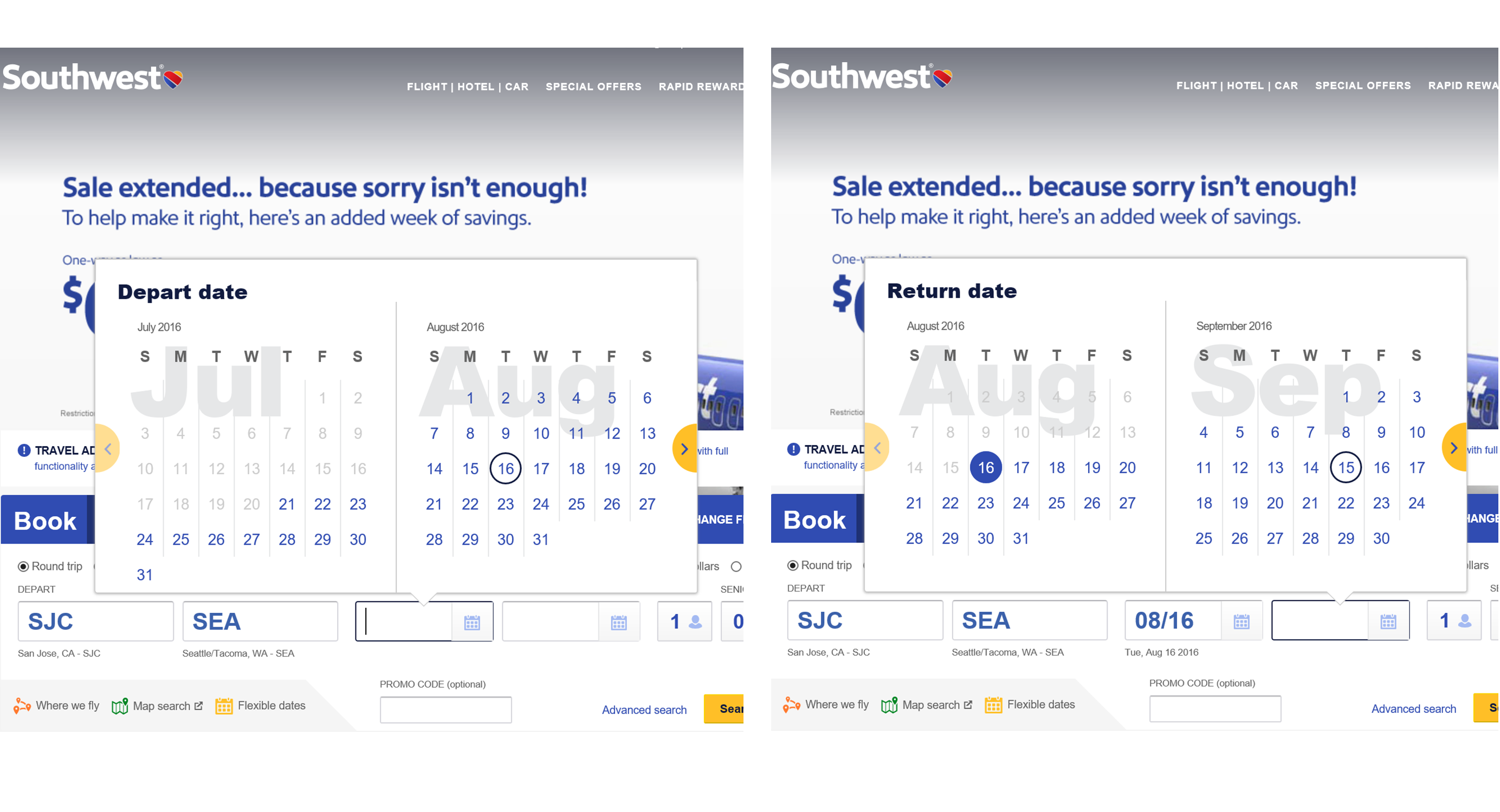 案例:Southwest Airlines。在 Southwest Airlines 的日期選擇器中,使用者選擇了出發日期8-16-16,但返回日期範圍從“7月-8月”變為“8月-9月”,這種變化可能被使用者忽視,導致錯誤選擇。