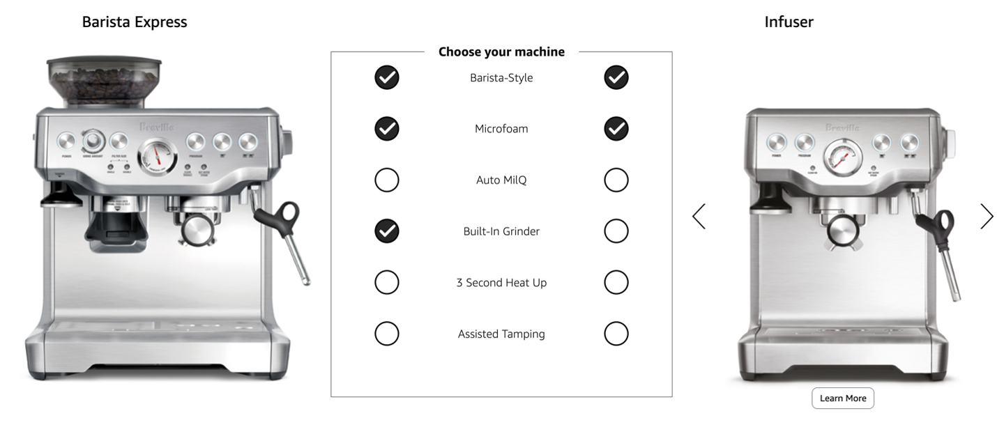 如果選項差異較多但只有少數幾項是使用者決策的關鍵,需重點展示這些特性,並使用“逐步披露”(progressive disclosure)為有需求的使用者提供次要特性的細節。