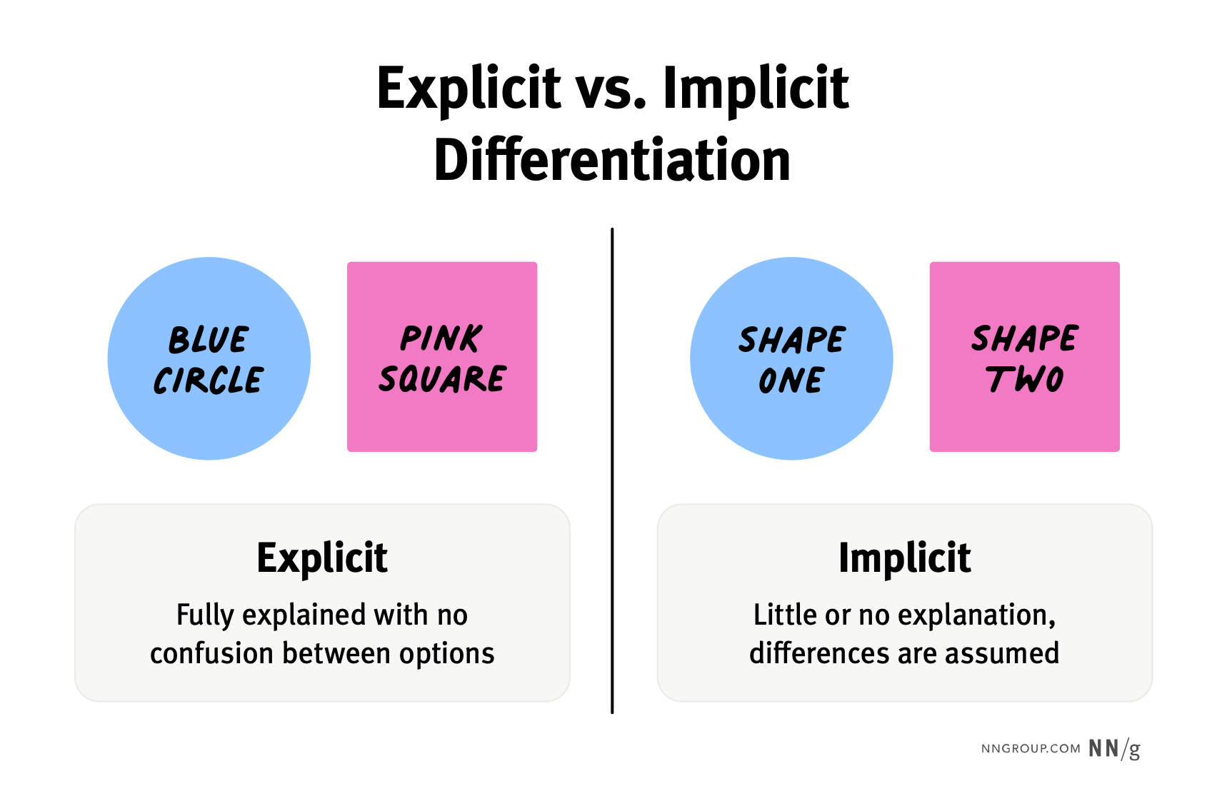 - 示例:在右側,藍色圓形和粉色方形分別標註為“Shape One”和“Shape Two”。這些標籤並未揭示顏色和形狀的差異,導致使用者需要額外思考或猜測其具體含義。