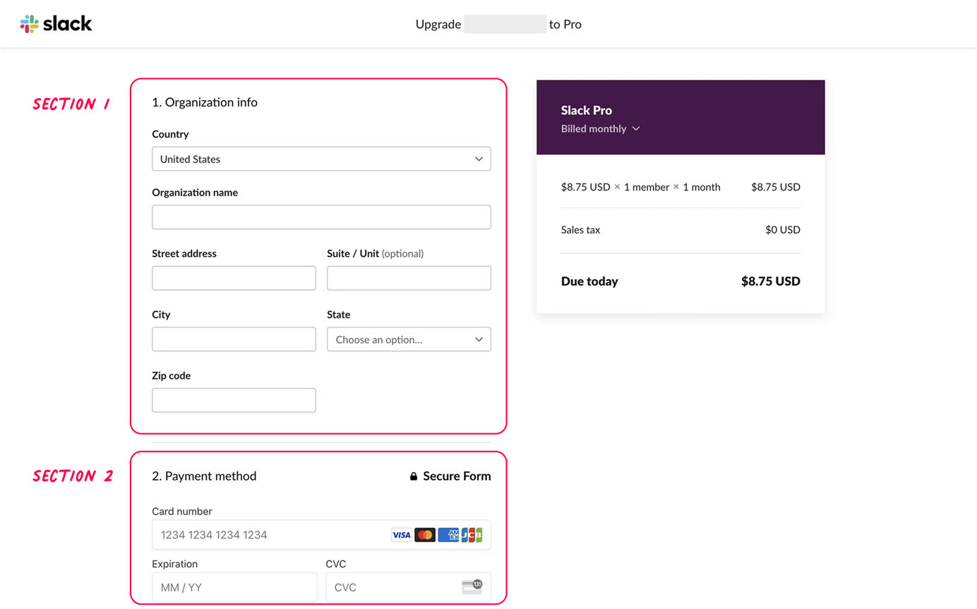 透過統一的間距、排版和樣式來引導使用者注意力,理清表單內部的關係。Stripe 使用了統一間距來組織資訊。地址相關欄位之間間距較小,而與不相關欄位(如電子郵件)間距更大。但示例中使用了佔位符文字,增加了認知負擔。
