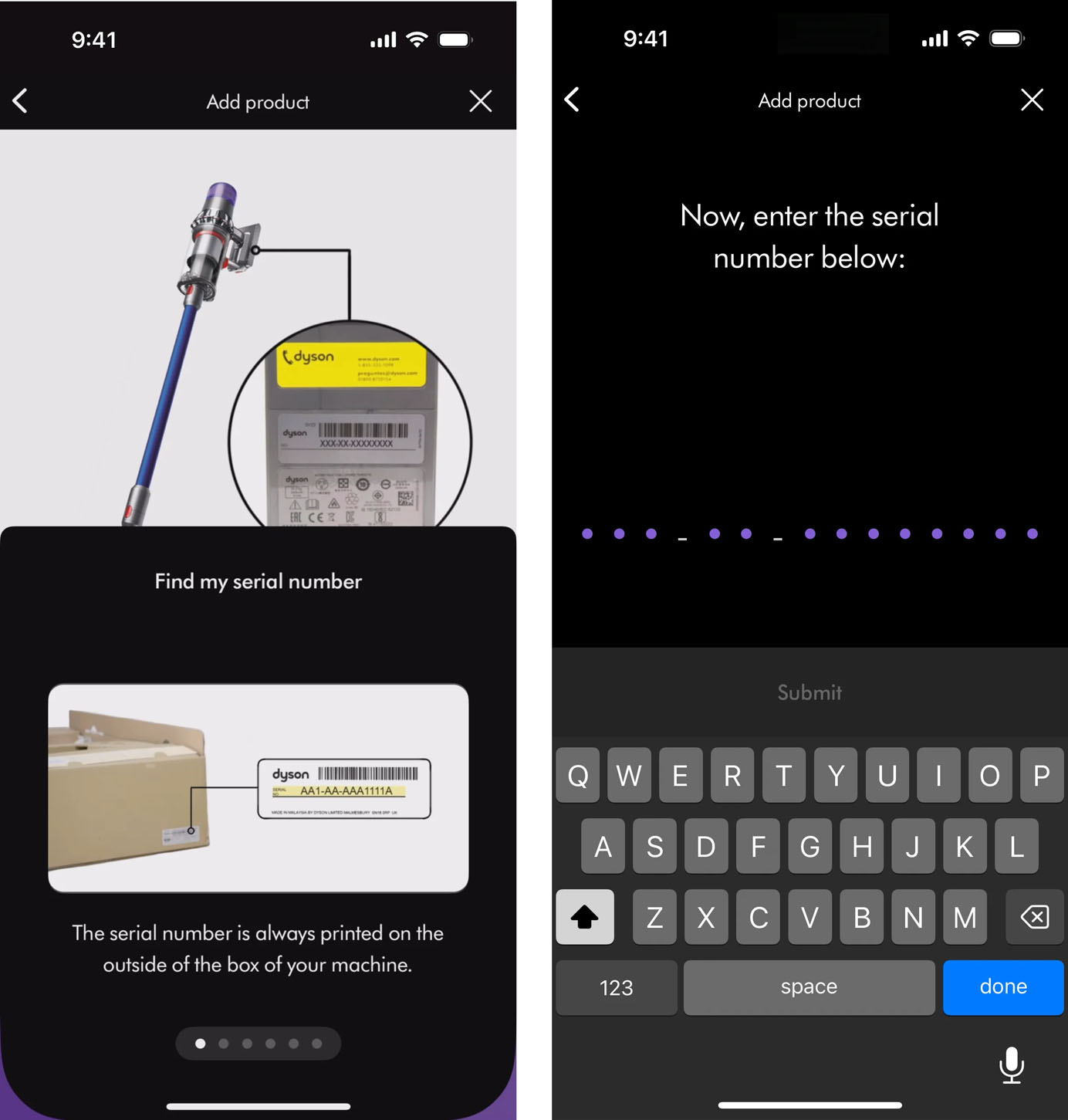 Dyson 在使用者填寫序列號時,提供了序列號的位置和格式說明,使使用者快速定位並正確輸入。