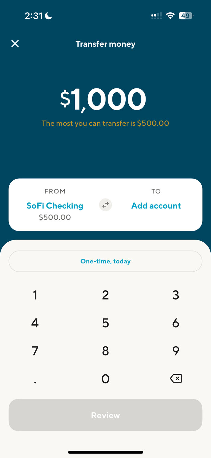 在可預測情況下,提前限制錯誤輸入優於事後報錯。例如,在轉賬表單中,防止輸入超過賬戶餘額的金額。SoFi 限制轉賬金額不能超過賬戶餘額,超過時以暗背景與錯誤提示明確告知。