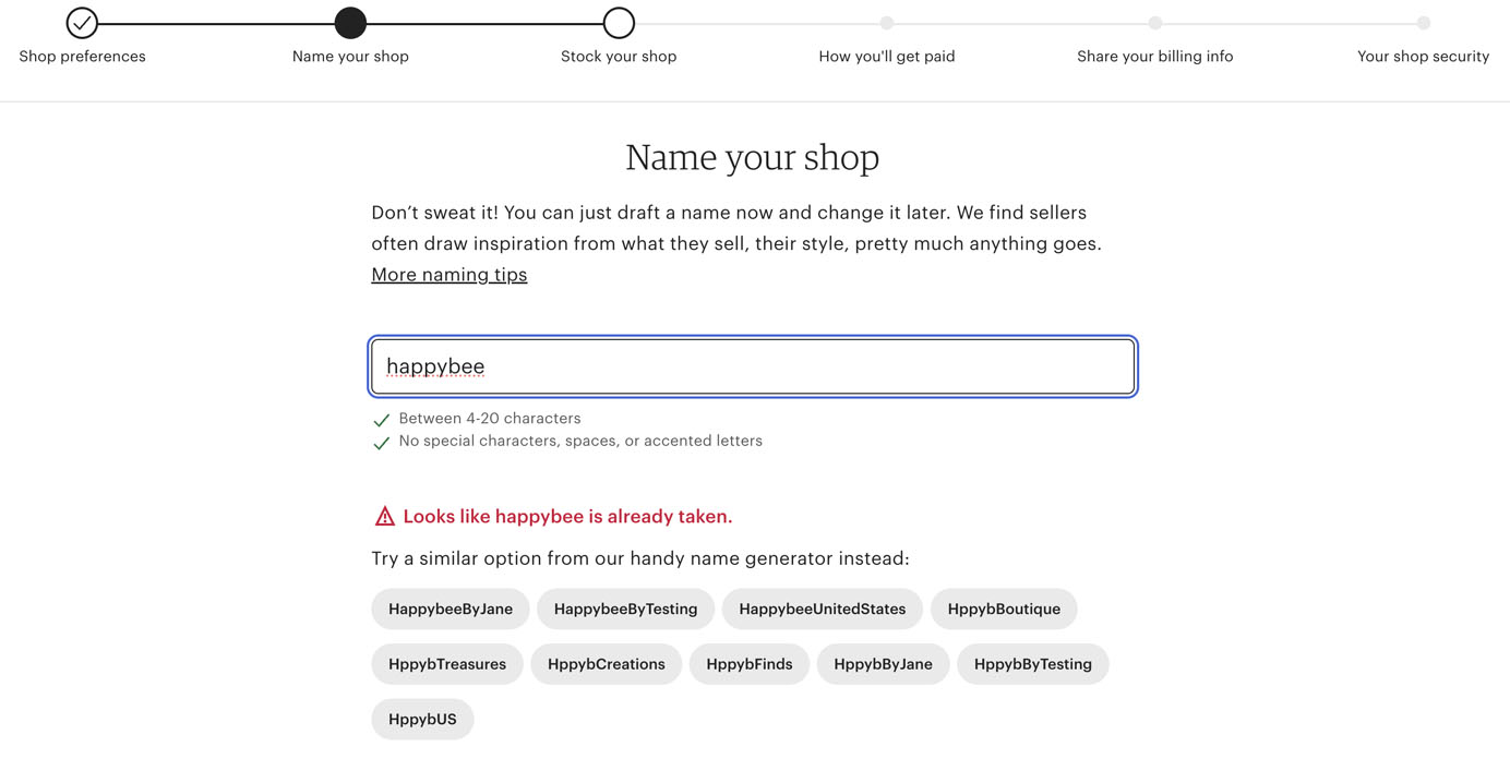 錯誤提示應具有指導性,而非只是指出問題,應幫助使用者改正。Etsy 在使用者名稱不可用時,不僅提示錯誤,還根據使用者輸入建議多個可用名稱,幫助使用者順利完成註冊。