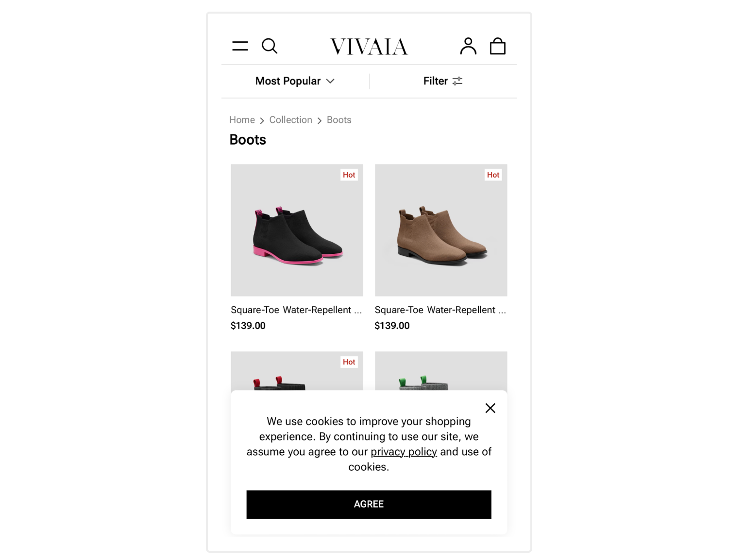 Vivaia(移動端)採用兩條線版本的漢堡圖示,因放在左上角,使用者也能正確識別。簡化樣式無礙識別,只要位置正確。