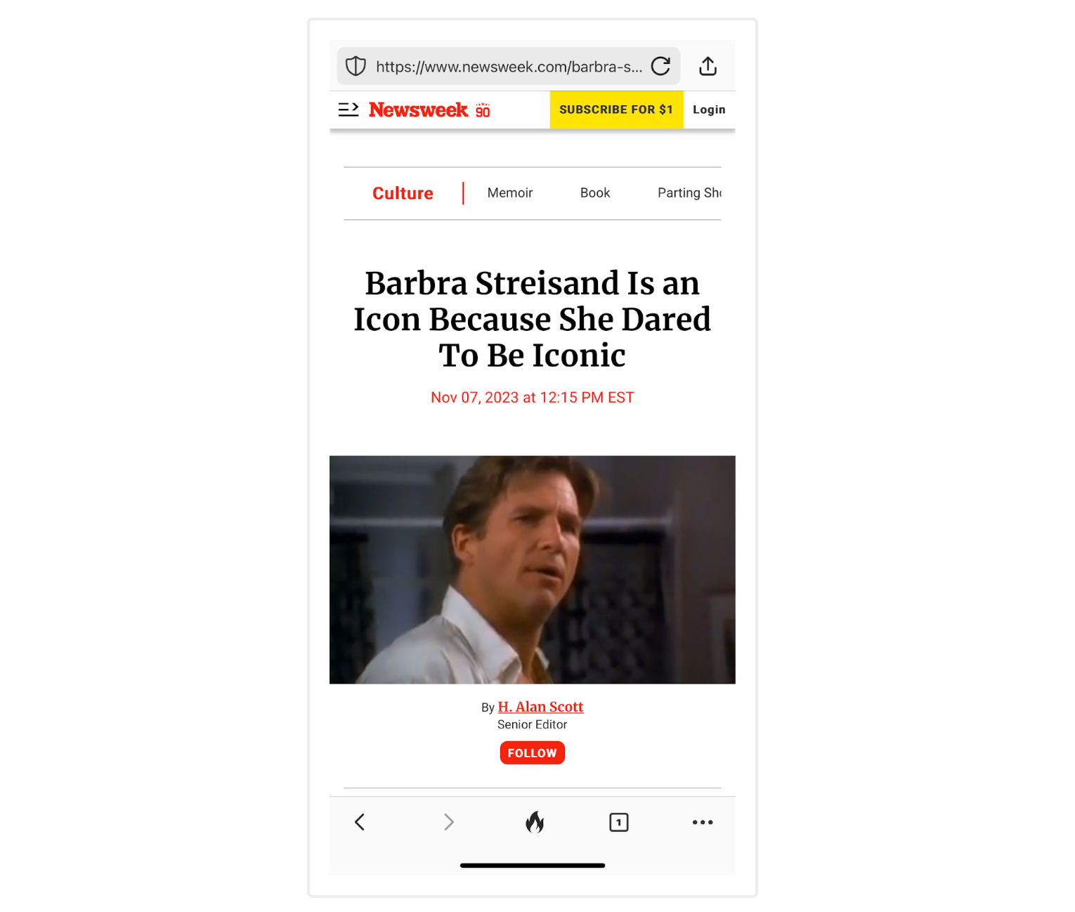 Newsweek(移動端)在三條線上加了一個箭頭,使用者仍能理解其是選單圖示。多餘裝飾可能被忽略,但建議保持圖示簡潔。
