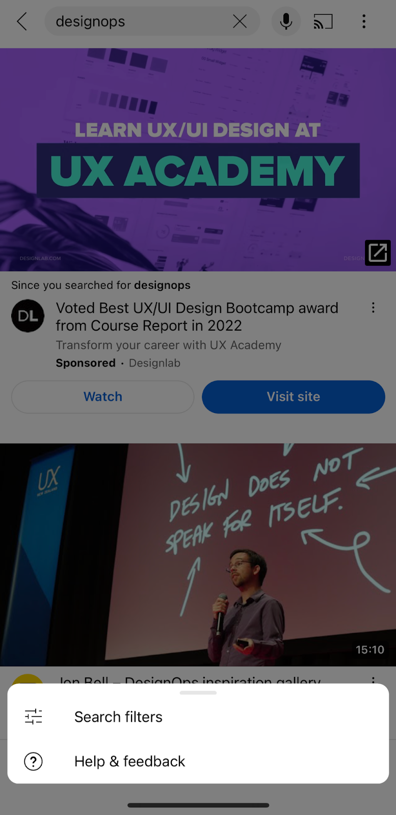 YouTube(移動端)底部選單中的“搜尋篩選器”圖示被誤解為分類列表或收藏列表。即使圖示不在左上角,線條分組圖示仍容易引發誤解。