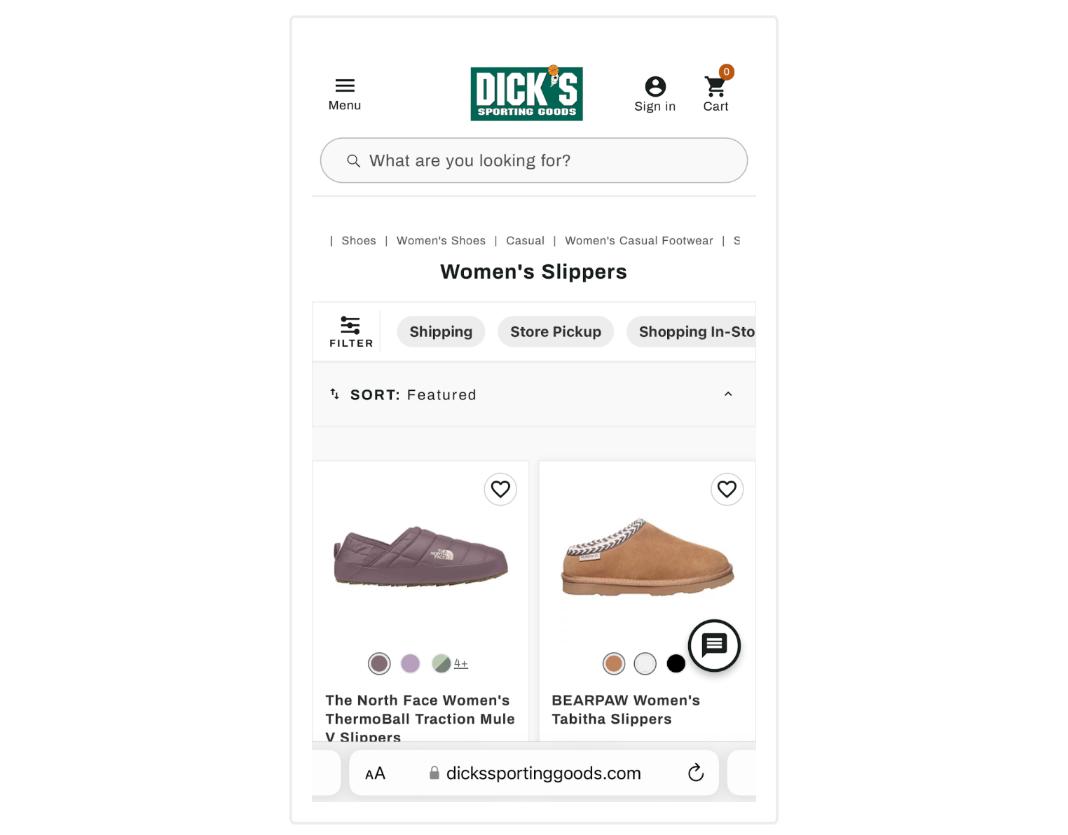 Dick's Sporting Goods(移動端)使用標準樣式的漢堡圖示,即使去掉了“Menu”文字標籤,使用者也能正確識別它為主選單。