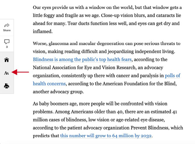 字型大小、對比度和排版是影響老年使用者閱讀體驗的重要因素。透過提供字型調整按鈕或啟用暗模式,能幫助視力下降的使用者更輕鬆地閱讀內容。例如,Washington Post在其網站中提供字型調整功能,使使用者能夠根據需要增大字型。