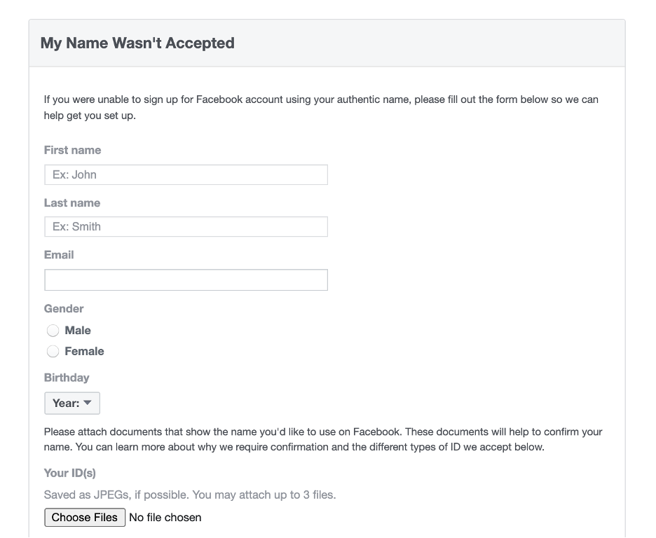 全球使用者的姓氏格式不同,有些姓氏中包含連字元、特殊字元或重音字元。某些稅務軟體(如TaxSlayer)受限於稅務局格式,無法識別包含這些字元的姓氏。為避免此類限制,Facebook設定了一個幫助頁面,供無法使用真實姓名註冊的使用者申請。