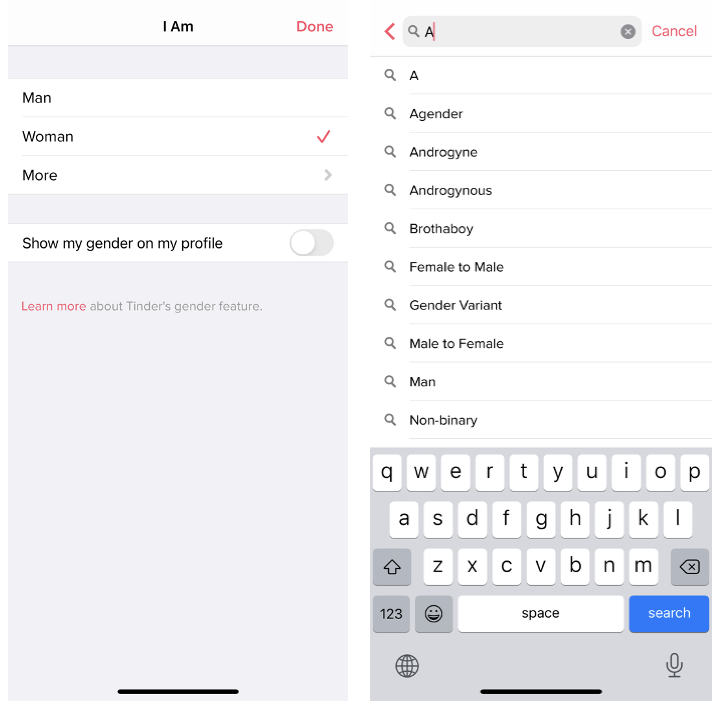 在需要提供身份資訊的表單(如種族、性別、性取向)中提供包容性選項。例如,Tinder允許使用者自定義性別身份,並提供30多種選項,以滿足使用者多樣化的需求。