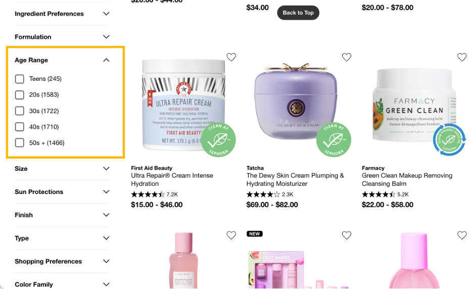 Pinterest提供按髮型型別(如捲髮、直髮)篩選的選項,幫助使用者更輕鬆地找到相關內容。類似地,Sephora允許使用者根據年齡段篩選護膚品,為不同年齡層的皮膚問題提供針對性推薦。