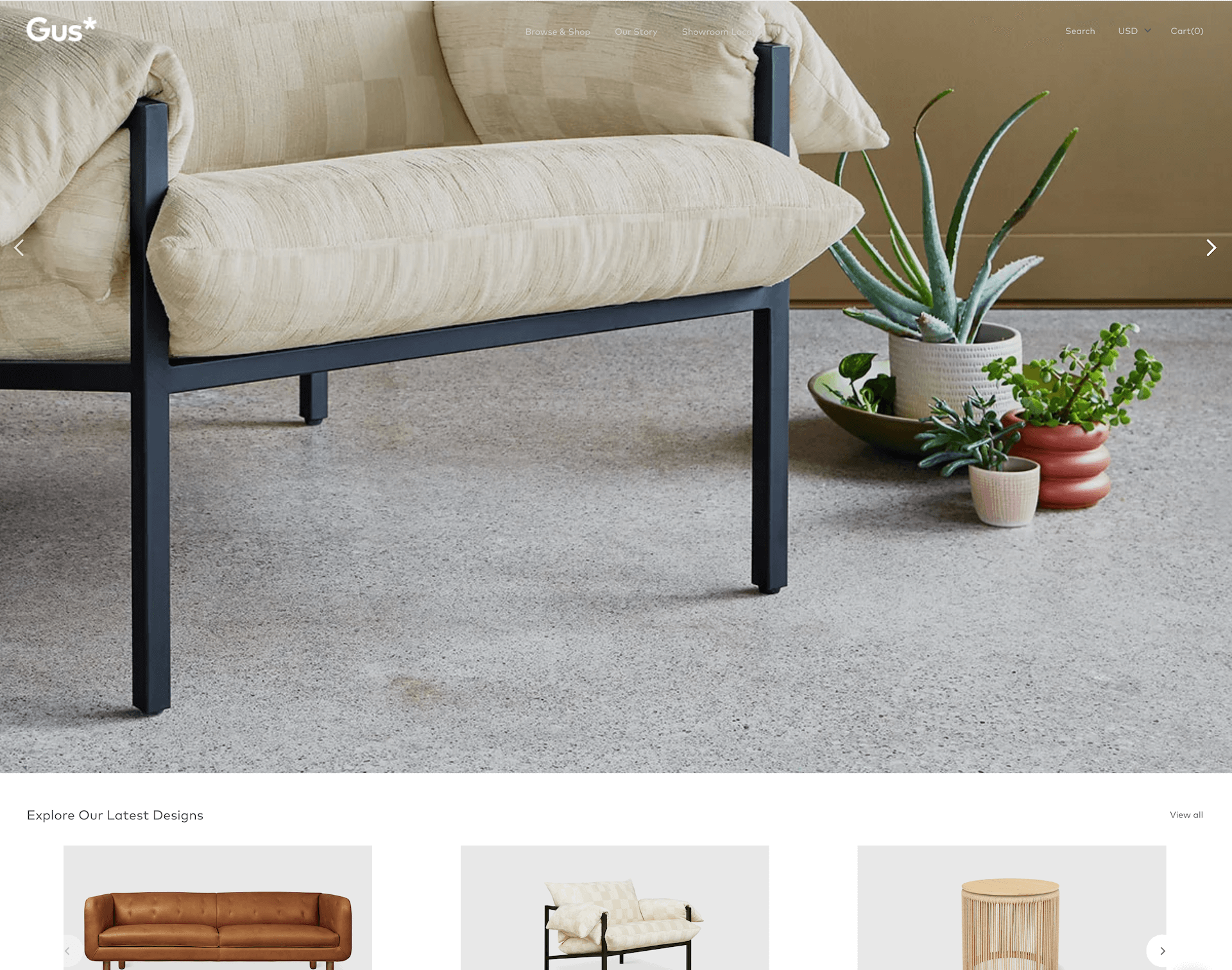 錯誤示例: Gus Modern 網站的透明導航條在背景輪播圖上幾乎無法辨認。